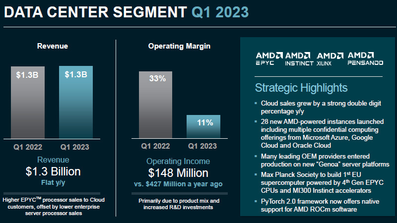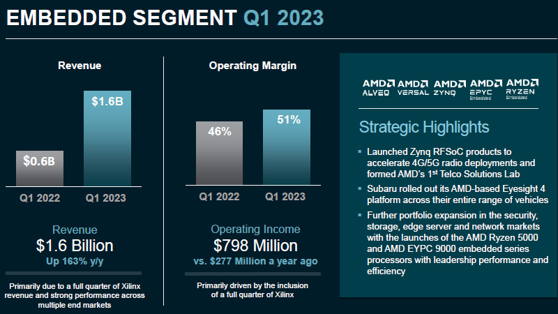 服务于 PC 市场的 AMD Client 部门本季度亏损最为严重,营业亏损为 1.72 亿美元(当前约 11.9 亿元人民币),收入为 7.39 亿美元,同比下降 65%。去年同期,客户集团实现了 21 亿美元的收入。