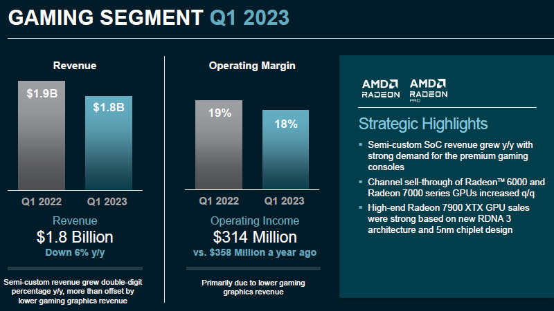 主要销售显卡的 Gaming 部门营业利润为 3.14 亿美元(当前约 21.73 亿元人民币),收入为 17.6 亿美元,略低于一年前的 18.6 亿美元。AMD 的数据中心集团报告的收入持平,为 12.9 亿美元。