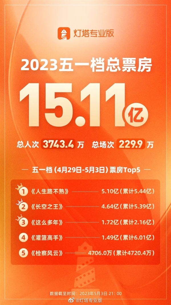 统计数据显示,截至北京时间5月3日24时,2023年“五一档”电影总票房超15亿元人民币,跻身中国影史“五一档”票房第三位,观影总人次3743.4万,总场次229.9万。