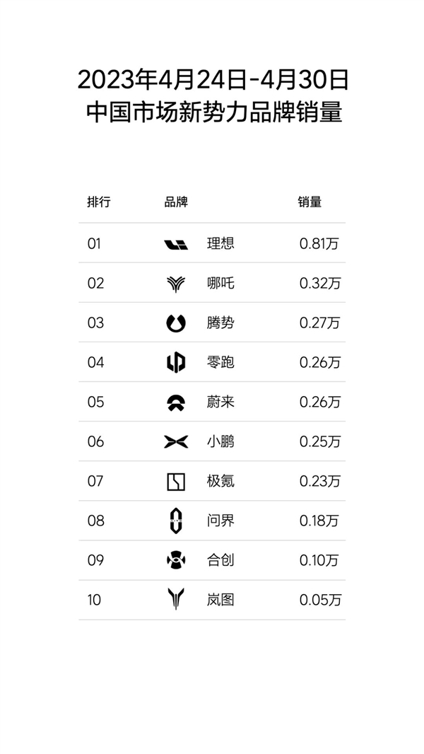 从最新公布的数据来看,理想位居榜首,哪吒第二(0.32万),腾势第三(0.27万),零跑第四(0.26万辆),第二三四名的总和才勉强超过理想,而后是蔚来、小鹏、极氪、问界、合创、岚图,周销不过1000-2600台,甚至不足千台,确实表现非常一般。