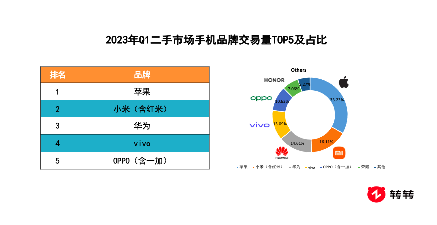 品牌方面,交易量排名相比上一季度无变化,苹果再次拔得头筹。具体来看,iPhone 交易量占比为 33.23%,环比微跌 0.11%。小米仍为国产第一,华为、vivo、OPPO(含一加)、荣耀紧随其后。相比 2022 年 Q4 仅苹果、华为出现交易量占比上涨的情况,2023 年 Q1 走势正相反,vivo、OPPO、荣耀等国产手机均出现交易量占比上涨的情况。