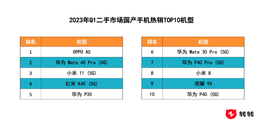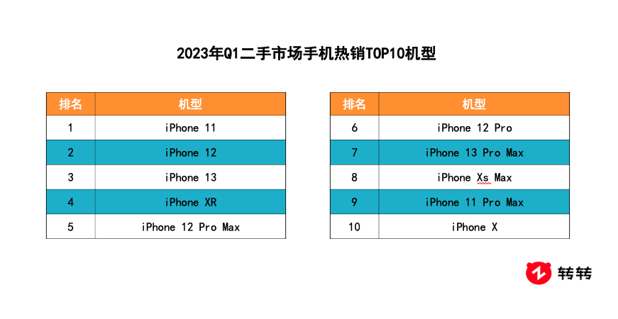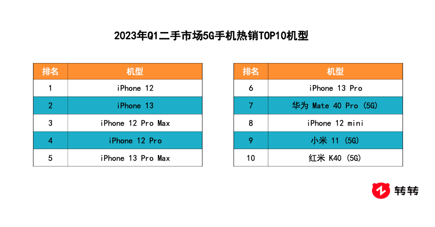 值得关注的是,Q1 转转集团手机行情显示,在交易量 Top10 机型榜单上,5G iPhone 上榜量由上季度的 6 席下降至 5 席,4G 和 5G 手机回到 “五五开” 局面。