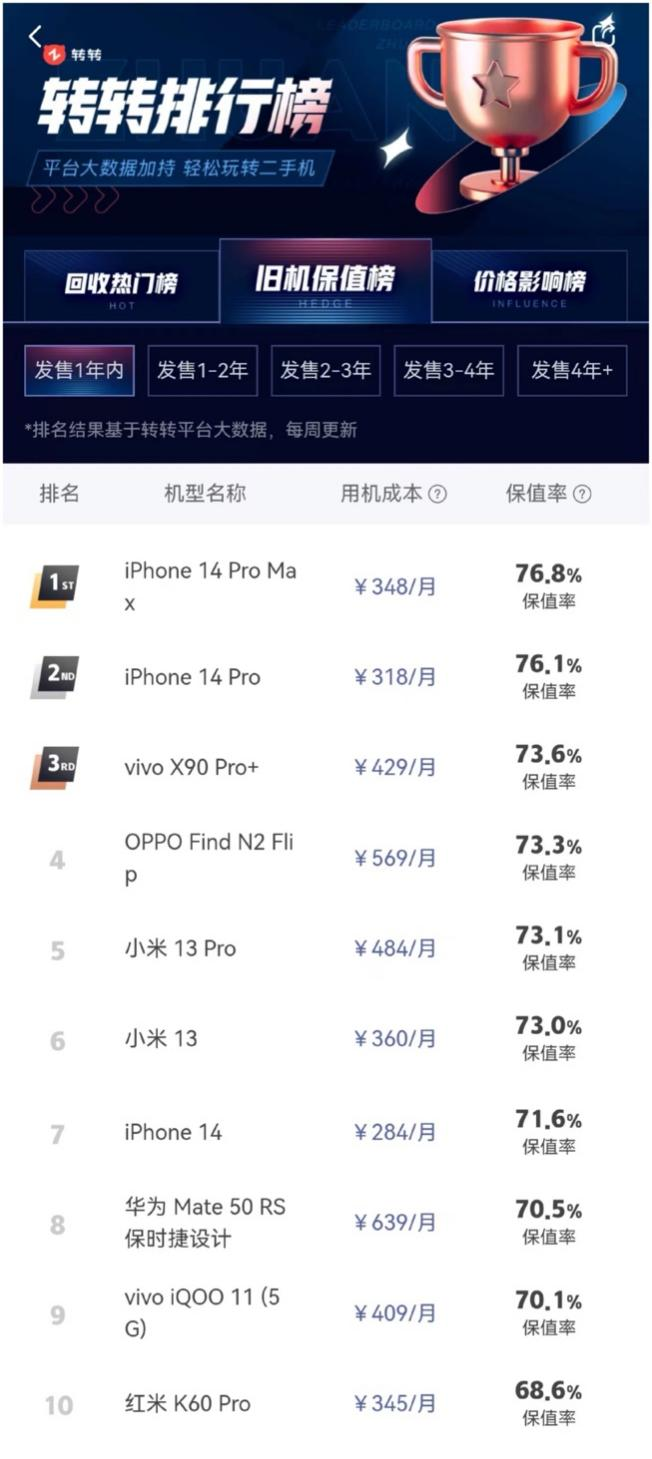 Q1 转转集团手机行情显示,iPhone14 Pro Max、iPhone14 Pro 排在保值率榜单的前两名,但保值率数值有所下降,分别为 76.8%、76.1%。vivo X90 Pro + 以 73.6% 的保值率排在第 3 名。与转转集团数据部的分析师预测一致,去年压轴发布的 OPPO Find N2 系列在二手市场崭露头角。保值率榜单上,该机型以 73.3% 的保值率排在第 4 名。