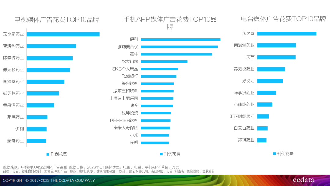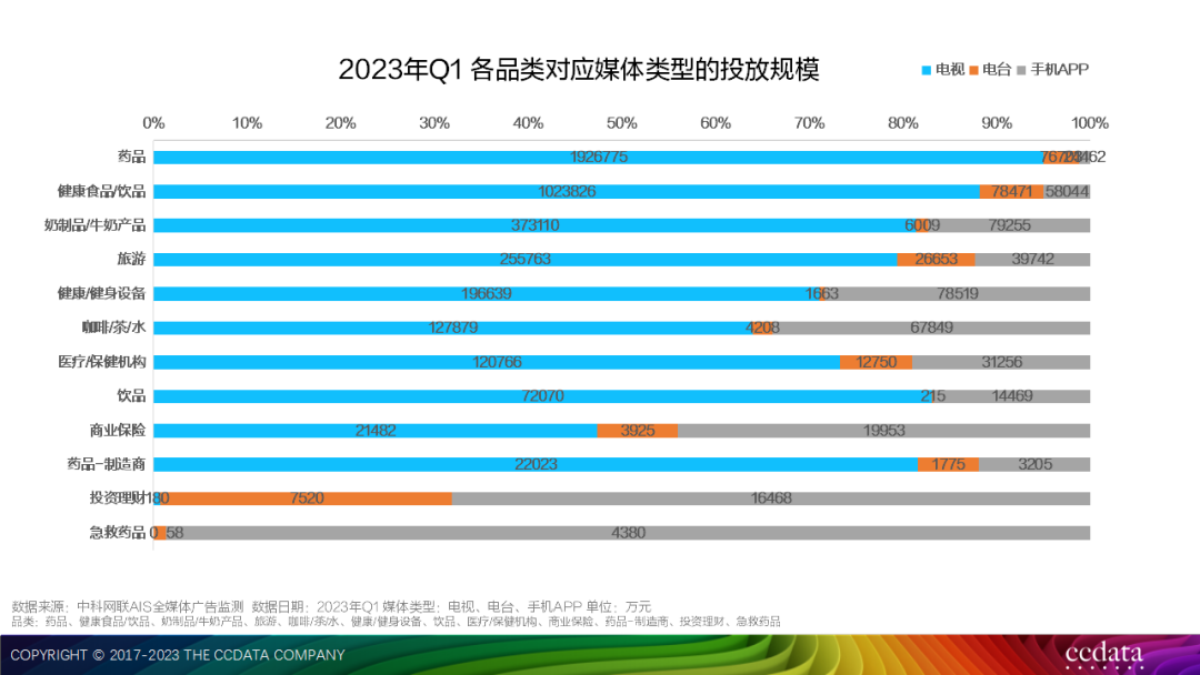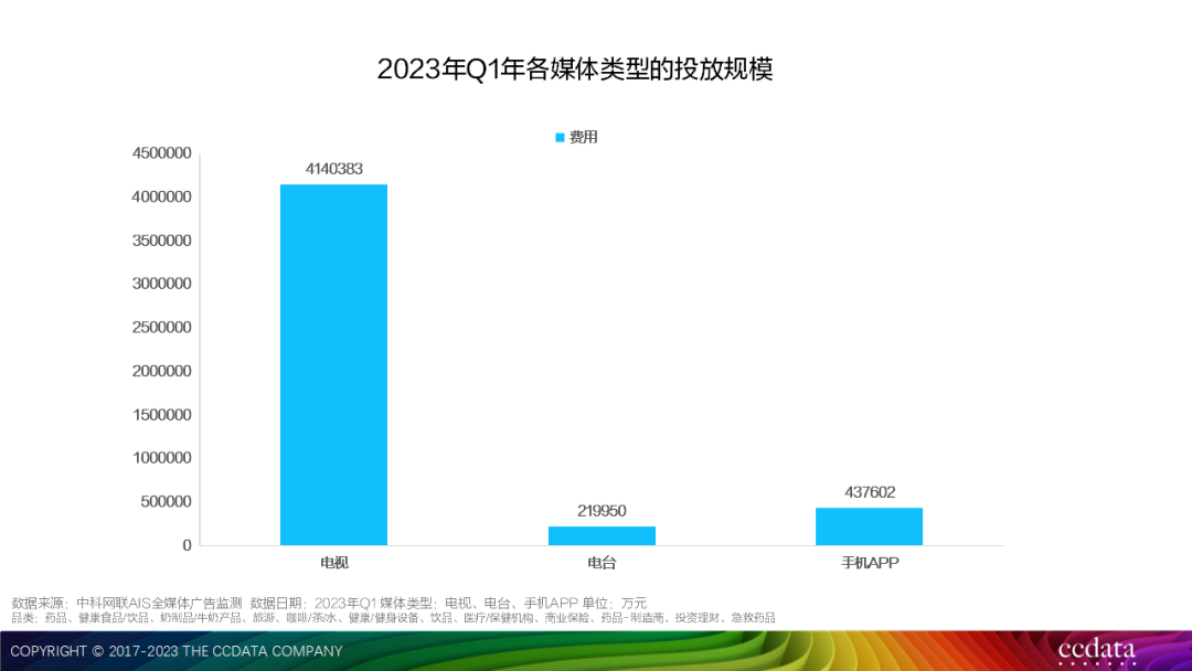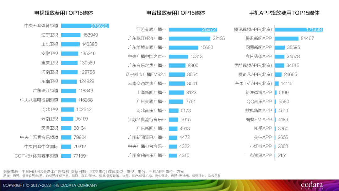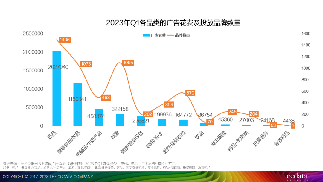 中科网联:2023年第一季度银发人群品牌市场投放分析 随着大众对于美好生活的向往日益增加,银发群体也愈益重视生活质量,对于面向银发群体的产品购买和使用体验都有了更高的要求。中科网联AIS全媒体广告监测数据显示,与银发消费相关的12大品类在2023年Q1投放刊例总金额超500亿元。本文通过分析银发人群类品牌的广告投放花费数据,帮助广告主、品牌方了解广告投放趋势及渠道选择。 更多阅读:中科网联:2022年11月全国网收视月度盘点中科网联CCData:2023年4月全国网收视月度盘点中科网联:2022年9月全媒体广告市场投放盘点中科网联:2022年9月全国网收视月度盘点中科网联:2022年10月全国网收视月度盘点CTR:中小城市青年观众电视收视特征简析Lexington Law:美国的千禧一代对股市并不“感冒”专业至上,价值为王:知识问答类产品用户需求洞察报告货拉拉:95后的货车人生DT财经:2021年Z世代兴趣调查中国电影海外网络受众接受度的实证研究:2021年度中国电影国际传播调研伟大航路咨询:元气森林用户研究报告企鹅智库:2020-2021智能手机消费趋势与用户忠诚/流失度报告新能源汽车用户画像浅析特殊时期的消费:疫情对全国&湖北网民消费影响报告