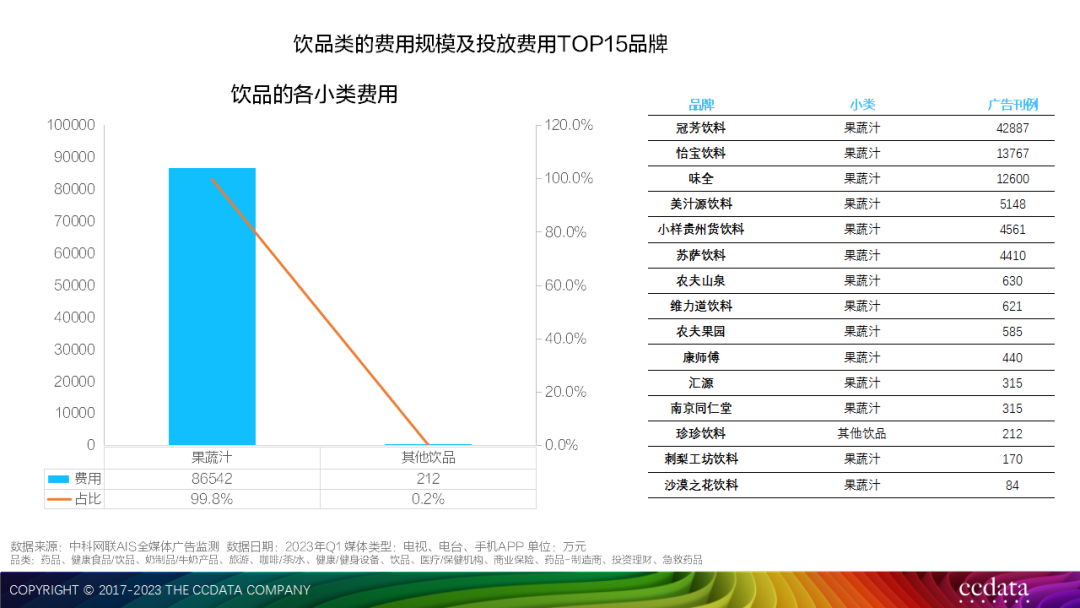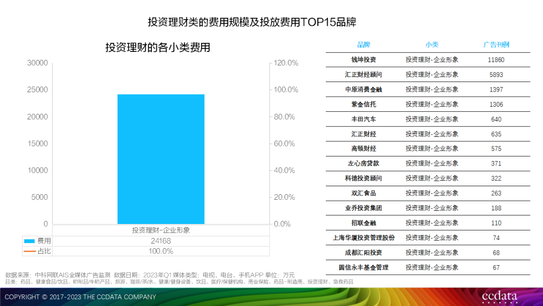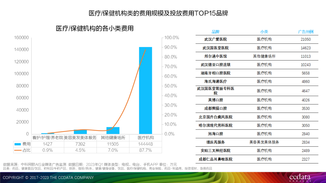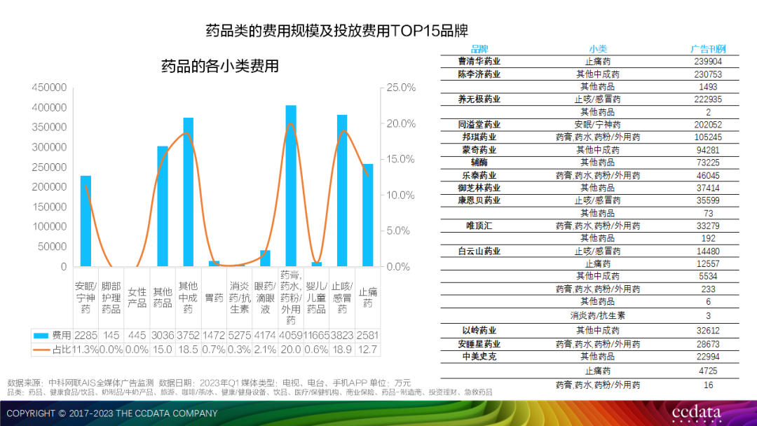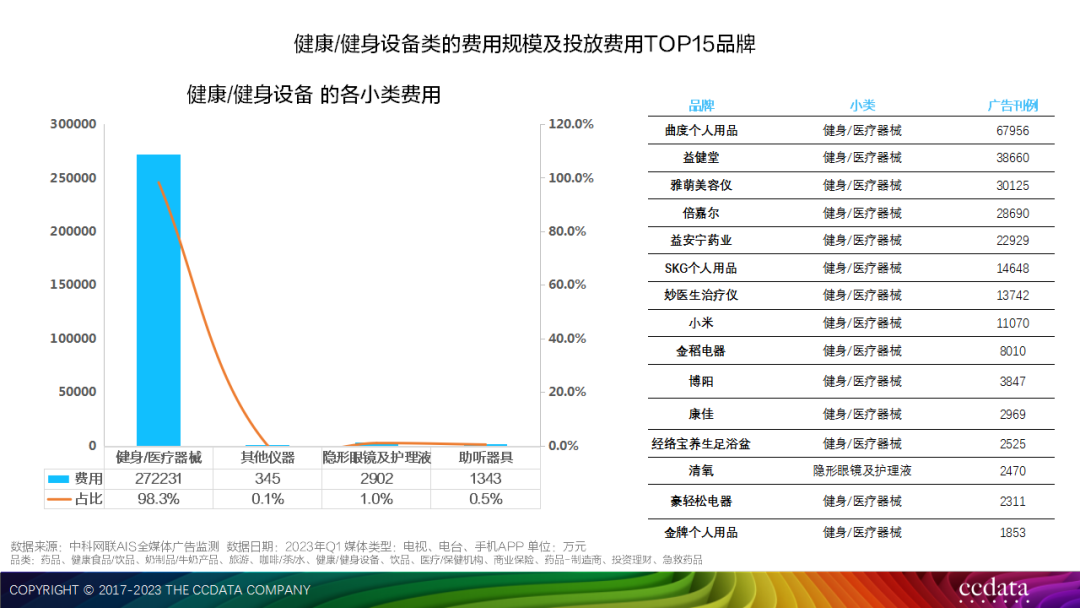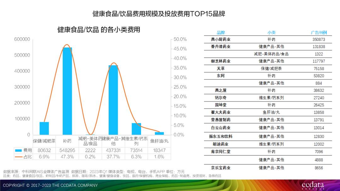 中科网联:2023年第一季度银发人群品牌市场投放分析 随着大众对于美好生活的向往日益增加,银发群体也愈益重视生活质量,对于面向银发群体的产品购买和使用体验都有了更高的要求。中科网联AIS全媒体广告监测数据显示,与银发消费相关的12大品类在2023年Q1投放刊例总金额超500亿元。本文通过分析银发人群类品牌的广告投放花费数据,帮助广告主、品牌方了解广告投放趋势及渠道选择。 更多阅读:中科网联:2022年11月全国网收视月度盘点中科网联CCData:2023年4月全国网收视月度盘点中科网联:2022年9月全媒体广告市场投放盘点中科网联:2022年9月全国网收视月度盘点中科网联:2022年10月全国网收视月度盘点CTR:中小城市青年观众电视收视特征简析Lexington Law:美国的千禧一代对股市并不“感冒”专业至上,价值为王:知识问答类产品用户需求洞察报告货拉拉:95后的货车人生DT财经:2021年Z世代兴趣调查中国电影海外网络受众接受度的实证研究:2021年度中国电影国际传播调研伟大航路咨询:元气森林用户研究报告企鹅智库:2020-2021智能手机消费趋势与用户忠诚/流失度报告新能源汽车用户画像浅析特殊时期的消费:疫情对全国&湖北网民消费影响报告