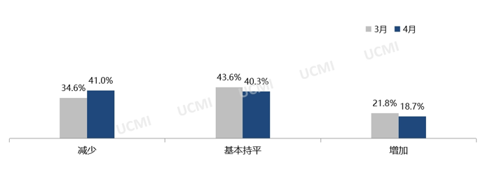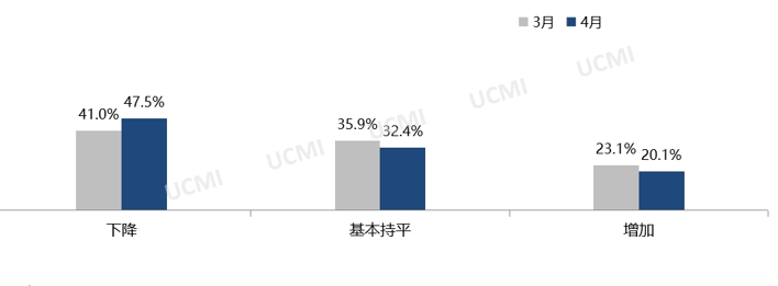 调查显示,4月份市场总需有所减少,其中认为“减少”的二手车经理人比例为41.0%;“增加”的比例为18.7%;“持平”的比例为40.3%。