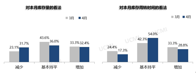 调查显示,4月份库存量与库存周转时间均有所增加。其中认为库存量“增加”的二手车经理人比例为32.4% ;认为库存周转时间“增加”的二手车经理人比例为28.8%。
