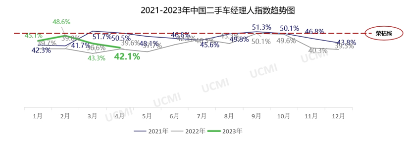 中国汽车流通协会发布最新一期“中国二手车经理人指数”(UCMI)。本期UCMI结果显示,4月份二手车经理人指数为42.1%,处于荣枯线以下,二手车市场景气度处于不景气区间。