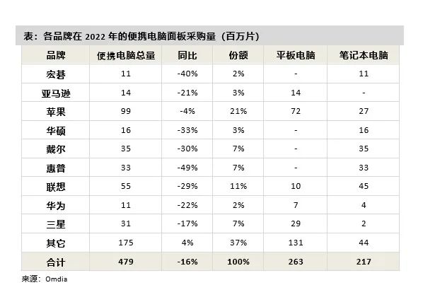 根据 Omdia《平板和笔记本电脑显示面板和 OEM 市场追踪报告》的最新研究显示,便携电脑面板(包括笔记本电脑和平板电脑)在 2022 年的总出货量达到了 4.79 亿片。这不仅是自 2020 年以来首次年出货量低于 5 亿片,还是自 2019 年来首次同比下滑 16%