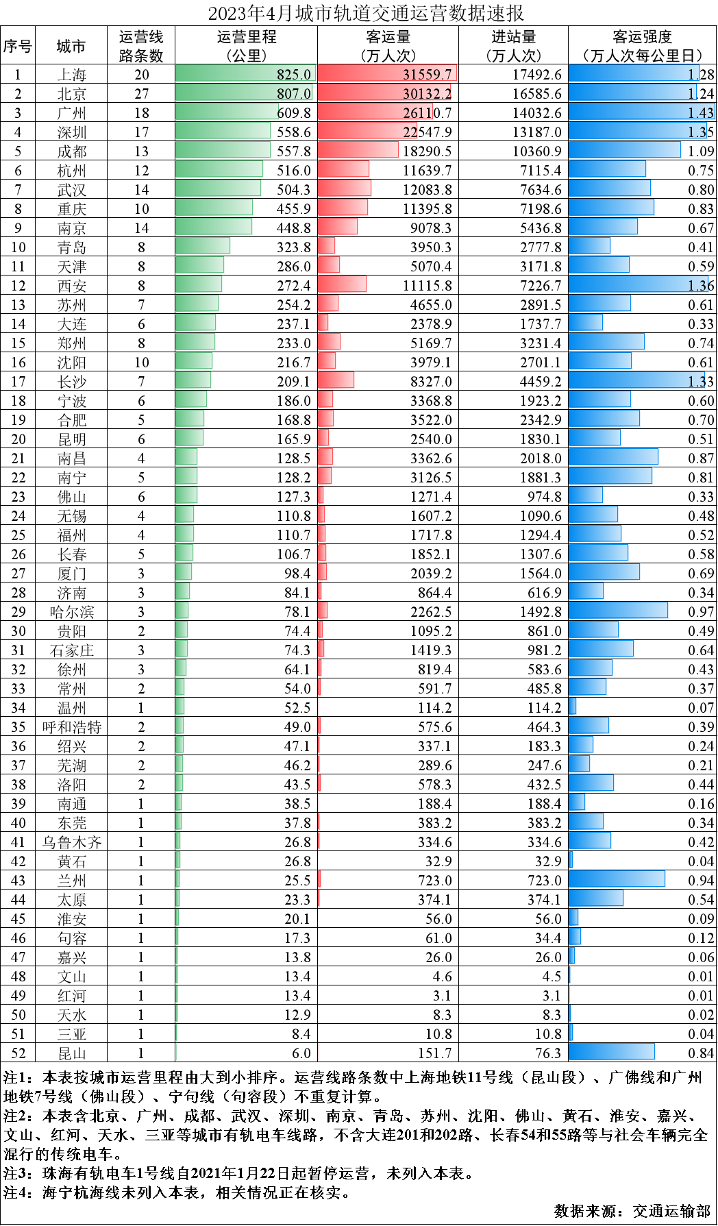 交通运输部:2023年4月城市轨道交通运营数据速报 2023年4月,31个省(自治区、直辖市)和新疆生产建设兵团共有54个城市开通运营城市轨道交通线路292条,运营里程9652.6公里,实际开行列车311万列次,完成客运量25.3亿人次,进站量15.2亿人次。4月份,客运量环比减少0.1亿人次、降低0.5%,同比增加12.4亿人次、增长95.8%,较2019年月均客运量增加5.4亿人次、增长27.3%。4月份客运强度平均水平为0.552万人次每公里日,较2019年全年客运强度平均水平增长1.2%。本月无新增运营线路和区段。 更多阅读:交通运输部:2023年7月城市轨道交通运营数据速报交通运输部:2023年6月城市轨道交通运营数据速报交通运输部:2022年10月城市轨道交通运营数据交通运输部:2021年11月城市轨道交通运营数据交通运输部:2022年1月城市轨道交通运营数据交通运输部:2022年9月城市轨道交通运营数据速报交通运输部:2023年2月城市轨道交通运营数据速报交通运输部:2021年9月城市轨道交通运营数据速报交通运输部:2024年4月城市轨道交通运营数据速报交通运输部:2024年6月城市轨道交通运营数据速报中国城市轨道交通协会:2018年中国城市轨道交通年度统计分析报告交通运输部:2023年4月交通运输行业主要统计指标交通运输部:2022年1月交通运输行业主要统计指标交通运输部:预计2023年春运期间客流总量约为20.95亿人次 同期增长99.5%交通运输部:中国交通的可持续发展白皮书