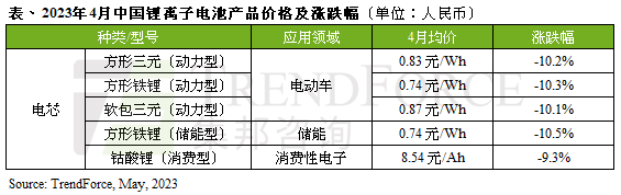 由于锂盐价格在 4 月止跌回稳前已续跌五个月,使各类锂离子电池产品价格回落至 2021 年底锂离子电池市场需求爆发前的水平。具体看产品价格(均以人民币计),4 月车用方形三元电芯、铁锂电芯和软包型三元动力电芯均价分别跌至 0.83 元 / Wh、0.74 元 / Wh 和 0.87 元 / Wh;储能电芯方面,4 月磷酸铁锂储能电芯月跌 10.5%,约 0.74 元 / Wh,而磷酸铁锂材料价格近期则已开始上涨,同时企业订单也开始回暖;消费电池电芯方面,钴酸锂电芯 4 月均价 8.54 元 / Ah,月跌 9.3%,同样近期钴酸锂市场有所回暖。