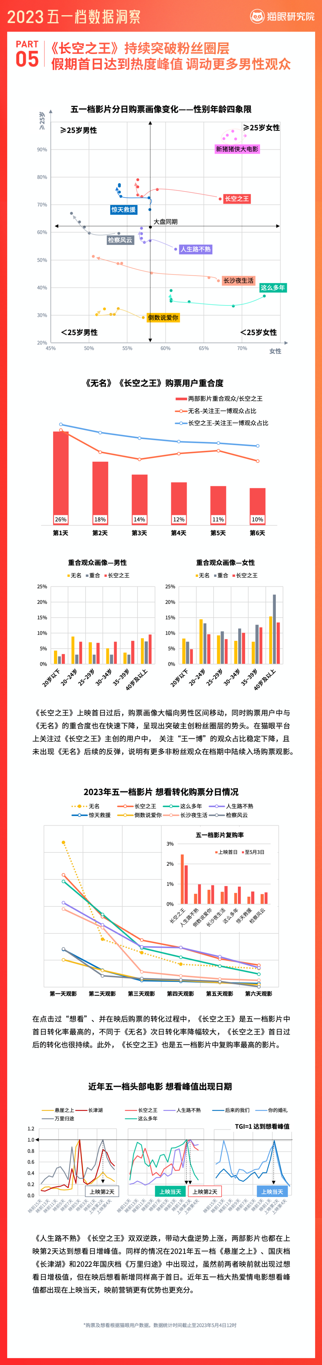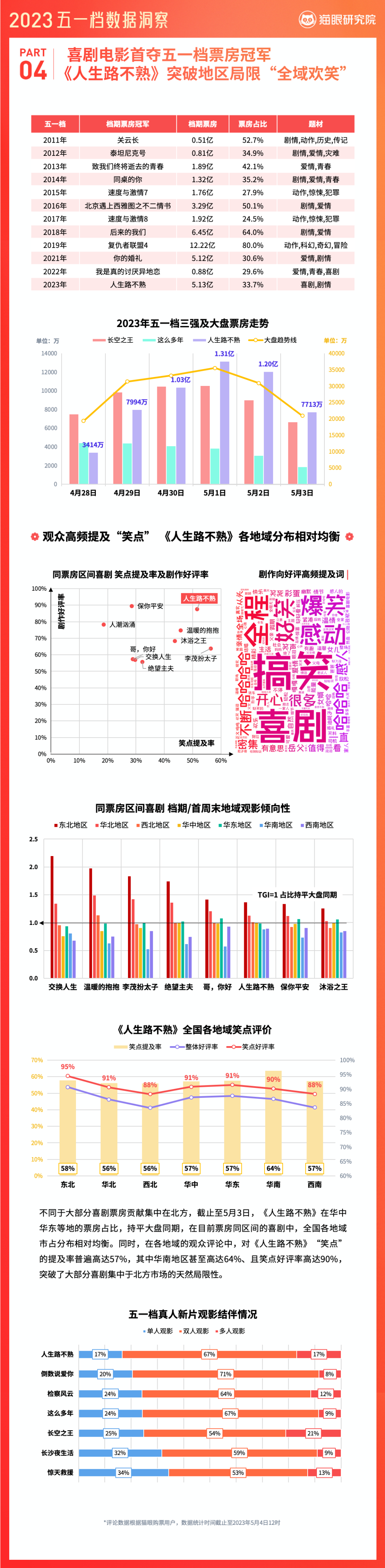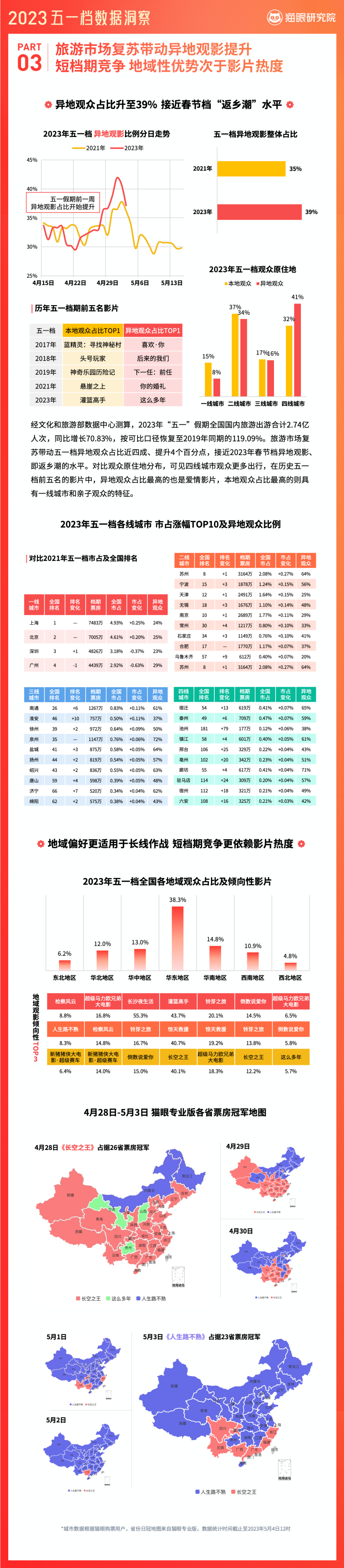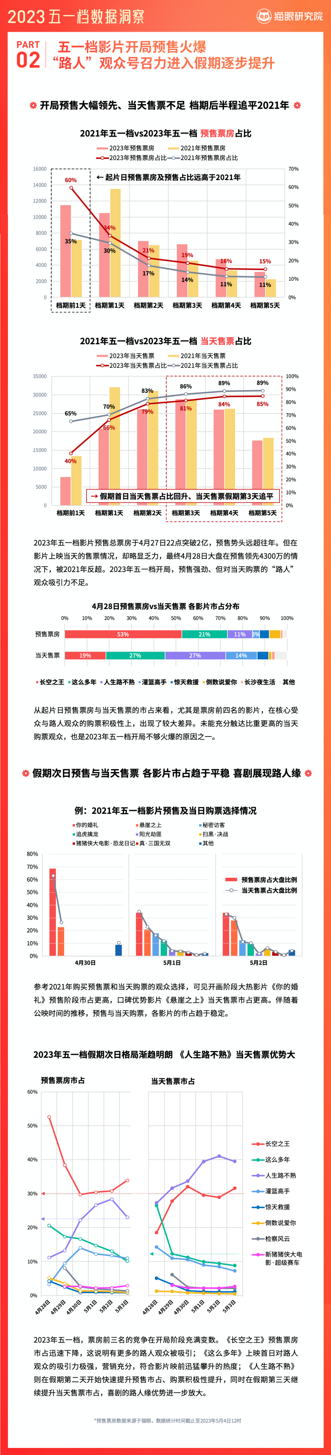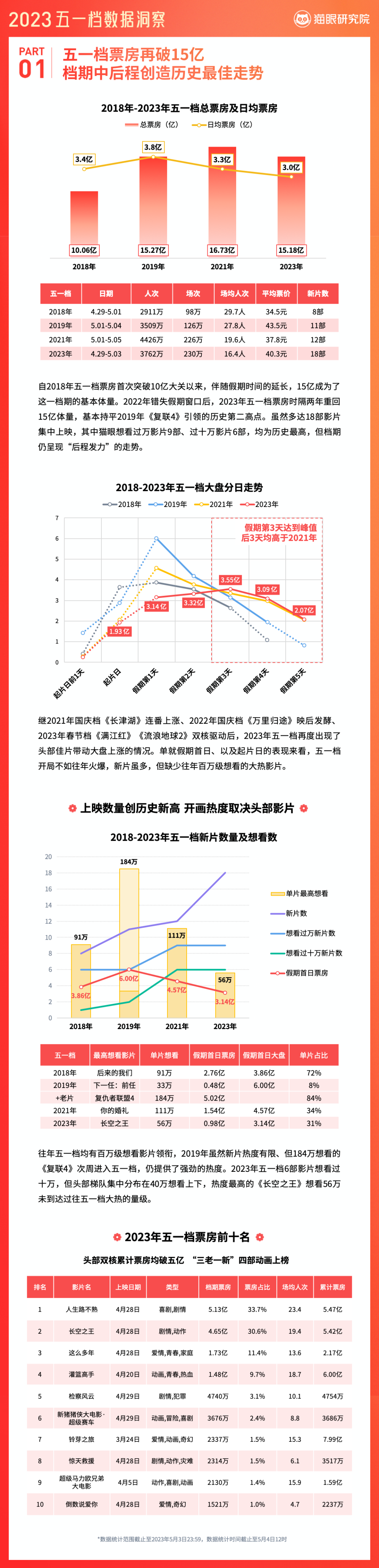猫眼研究院:2023年五一档数据洞察 更多阅读:猫眼:2025年五一档总票房破6亿猫眼研究院:春节档新片总票房(含点映)破亿!猫眼研究院:2021年度电影票房榜–TOP10国产电影占据8部猫眼研究院:2022国庆档总票房14.9亿猫眼研究院:2022年中秋节票房破1.4亿猫眼研究院:2023年度票房破250亿猫眼研究院:2022年短剧热度榜猫眼研究院:2022国庆档数据洞察猫眼研究院:《阿凡达2》进入2022全球票房榜第10位猫眼研究院:2022年贺岁档票房破6亿猫眼研究院:2023年5月猫眼「电视剧」热度榜猫眼研究院:2023年5月总票房破30亿猫眼研究院:2023年5月猫眼「网络剧」热度榜猫眼研究院:2023年2月猫眼角色热度冠军“高启强”猫眼研究院:2023年度大盘票房破200亿