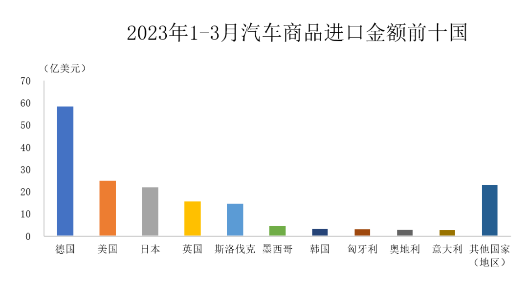 中国汽车工业协会:2023年一季度汽车商品进口金额前十国情况简析 据中国汽车工业协会整理的海关总署数据显示,2023年一季度,汽车商品进口金额排名前十位国家依次是德国、美国、日本、英国、斯洛伐克、墨西哥、韩国、匈牙利、奥地利和意大利。 与上年同期相比,英国和斯洛伐克进口金额呈微增,其他国家均呈不同程度的下降,其中日本、美国和韩国进口金额呈显著下降。 2023年一季度,上述十国汽车商品累计进口金额154.5亿美元,占全部汽车商品进口总额的86.9%。 更多阅读:中国汽车工业协会:2022年汽车商品进口金额前十国情况简析中国汽车工业协会:2023年1-2月汽车商品进口金额前十国情况简析中国汽车工业协会:2022年1-9月汽车商品进口金额前十国情况简析中国汽车工业协会:2021年1-9月汽车商品进口金额前十国简析中国汽车工业协会:2021年1-7月汽车商品进口金额前十国简析中国汽车工业协会:2023年1-2月海关进出口情况简析中国汽车工业协会:2022年1-11月汽车商品进口金额前十国情况简析中国汽车工业协会:2022年1-4月汽车商品进口金额前十国情况简析中国汽车工业协会:2021年1-8月汽车商品进口金额前十国家排名中国汽车工业协会:2022年3月前十位轿车品牌销量排名中国汽车工业协会:2023年1-2月我国汽车商品出口金额前十国情况简析中国汽车工业协会:2021年5月汽车工业运行情况简述中汽协会:2021年1-5月汽车商品进口金额排名前十位国家情况简析中国汽车工业协会:2023年1-8月前十位SUV生产企业销售情况简析中国汽车工业协会:2023年1-7月七大类汽车商品进出口金额情况
