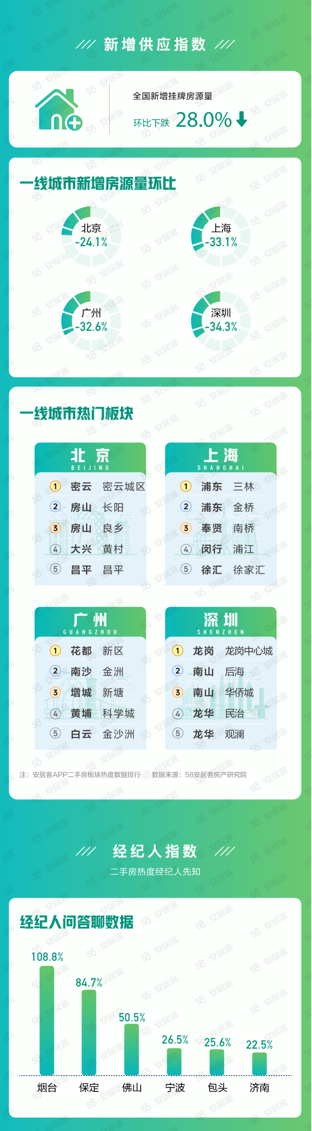 4月份全国新增挂牌房源量环比下跌28.0%。热门板块方面,北京密云、长阳、良乡、黄村和昌平;上海三林、金桥、南桥、浦江、和徐家汇;广州新区、金洲、新塘、科学城和金沙洲;深圳龙岗中心城、后海、华侨城、民治、观澜受到购房者的一致青睐。烟台、保定、佛山、宁波、包头、济南等城市经纪人回答购房者问题增多。