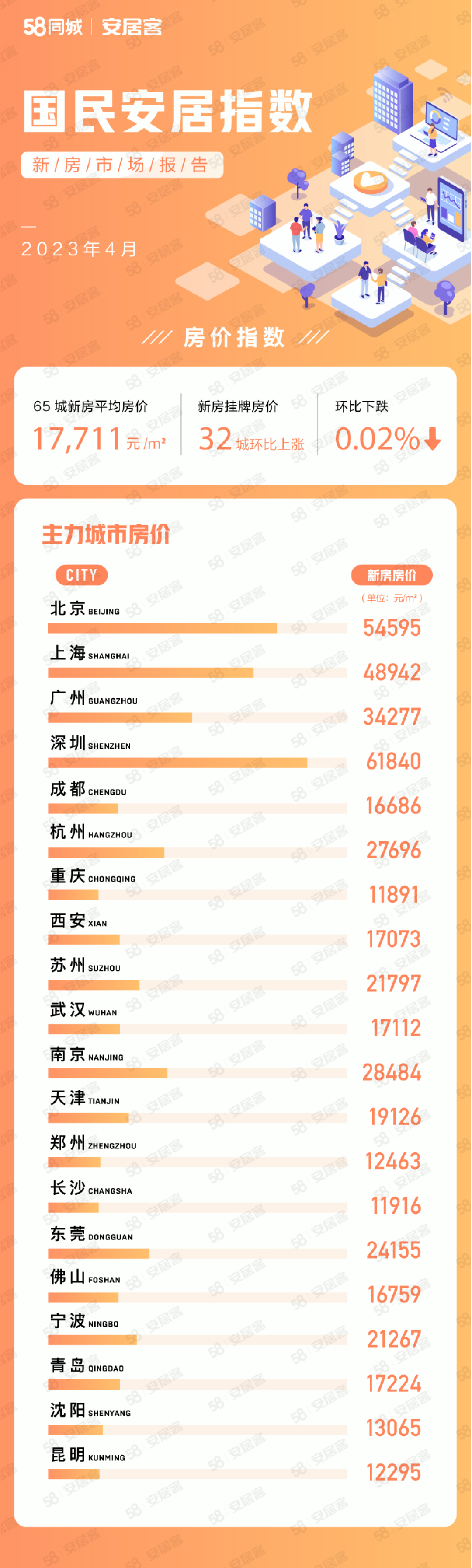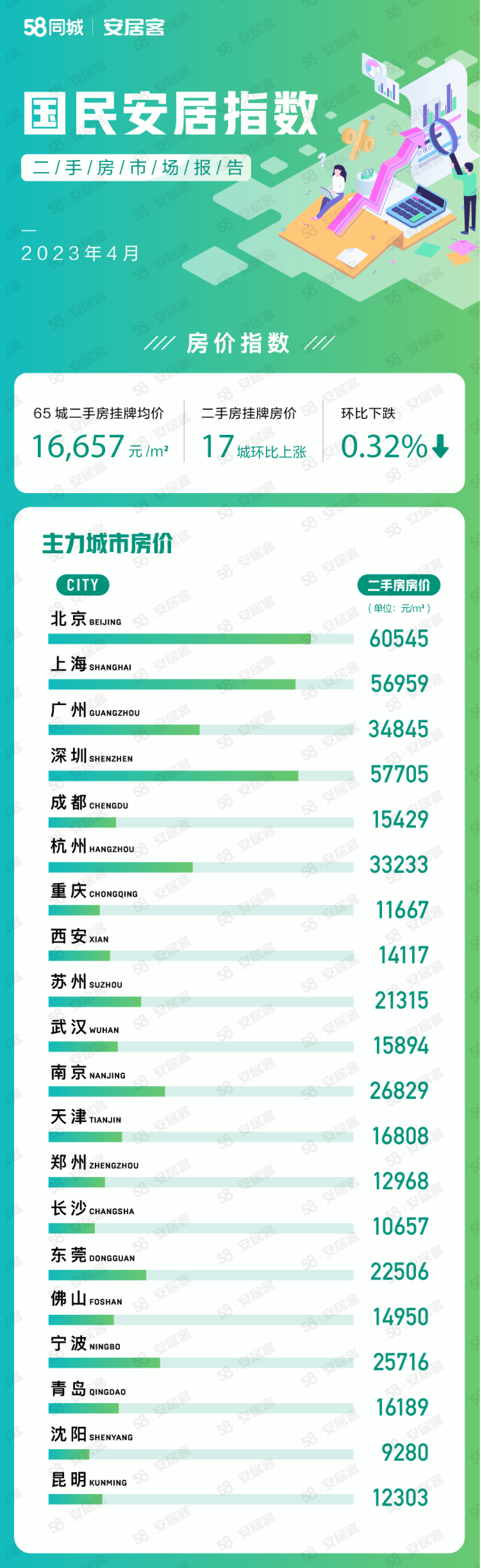 2023年《4月国民安居指数报告》已发布。报告显示,2023年4月,全国重点监测65城中,有32城新房价格环比上涨,二手房市场中,有17城二手房挂牌均价呈现环比上涨趋势。