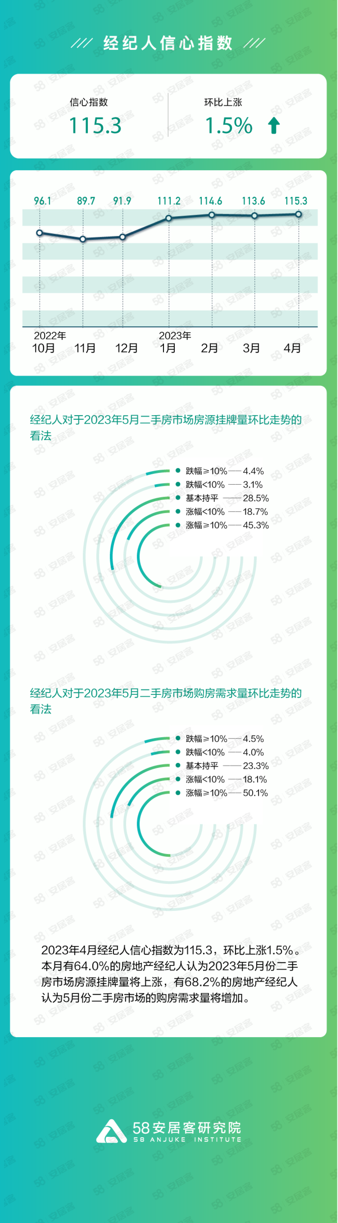 2023年4月房地产经纪人信心指数为115.3,环比上涨1.5%。本月有64.0%的房地产经纪人认为2023年5月份二手房市场房源挂牌量将上涨,有68.2%的房地产经纪人认为5月份二手房市场的购房需求量将增加。