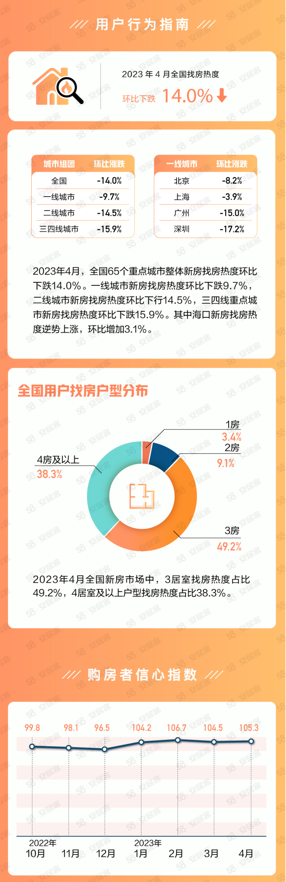 2023年4月,全国65个重点城市整体新房找房热度环比下跌14.0%。一线城市新房找房热度环比下跌9.7%,二线城市新房找房热度环比下行14.5%,三四线重点城市新房找房热度环比下跌15.9%。其中海口新房找房热度逆势上涨,环比增加3.1%。从各户型找房热度来看,在4月新房市场中,3居室找房热度占比49.2%,4居室及以上户型找房热度占比38.3%。