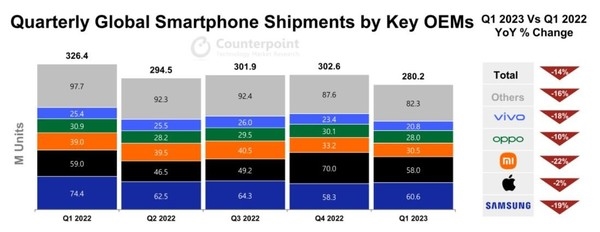 近日,市场分析机构Counterpoint和Canalys均公布了全球智能手机市场2023年第一季度的表现,市场大盘依旧在下行。Counterpoint数据显示,2023年第一季度全球智能手机出货量同比下降14%和环比下降7%至2.802亿部;Canalys数据显示,2023年第一季度全球智能手机出货量下降13%,跌至2.70亿部。