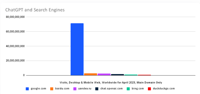 根据 SimilarWeb 统计,ChatGPT 上月(4 月份)全球访问量再创新高,达到 17.6 亿次,已超越必应、鸭鸭走 DuckDuckGo 等其他国际搜索引擎,并达到谷歌的 2%,百度的 60%。目前排在其前面的除了谷歌,只剩下中国的百度和俄罗斯的 Yandex。