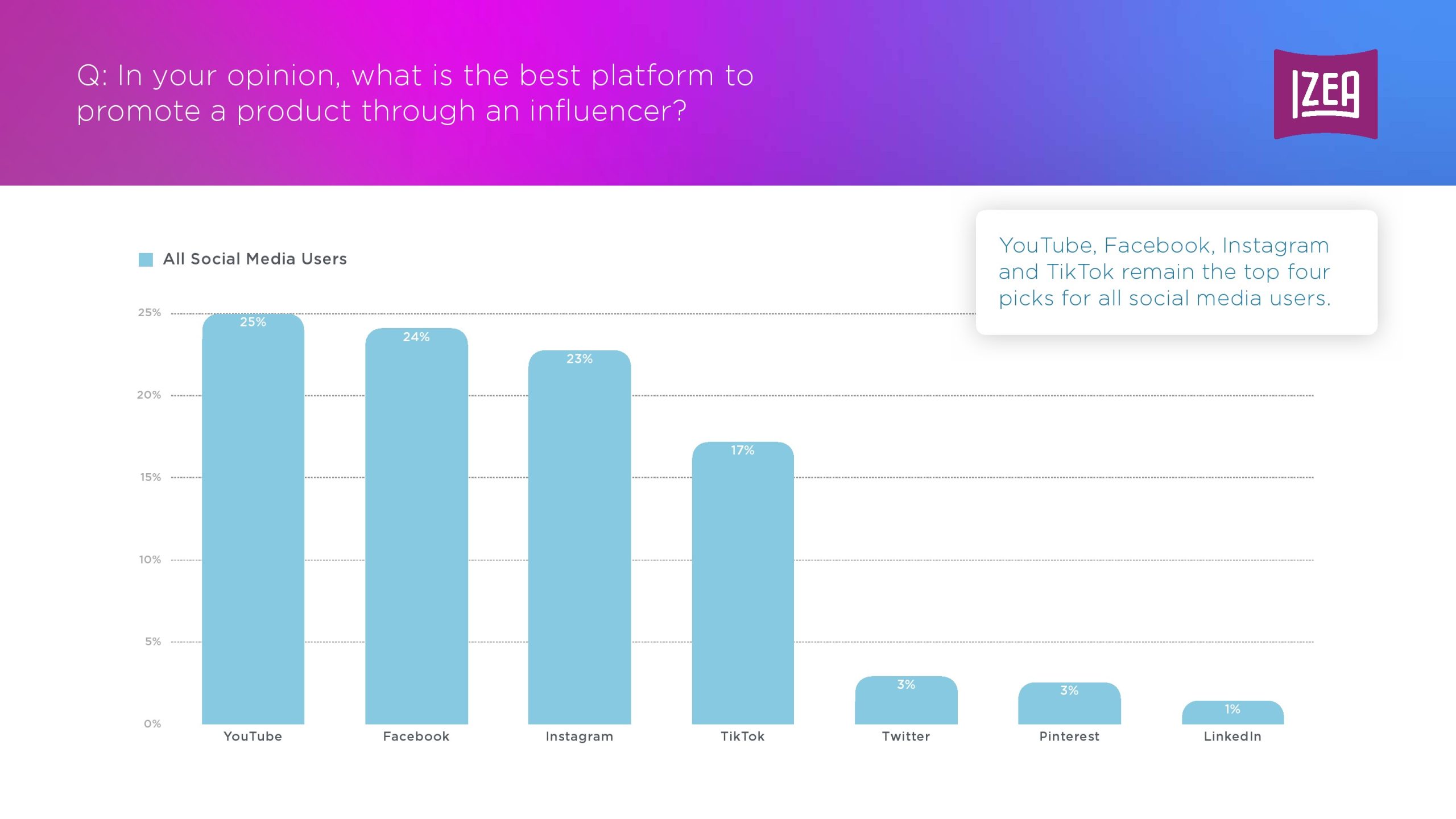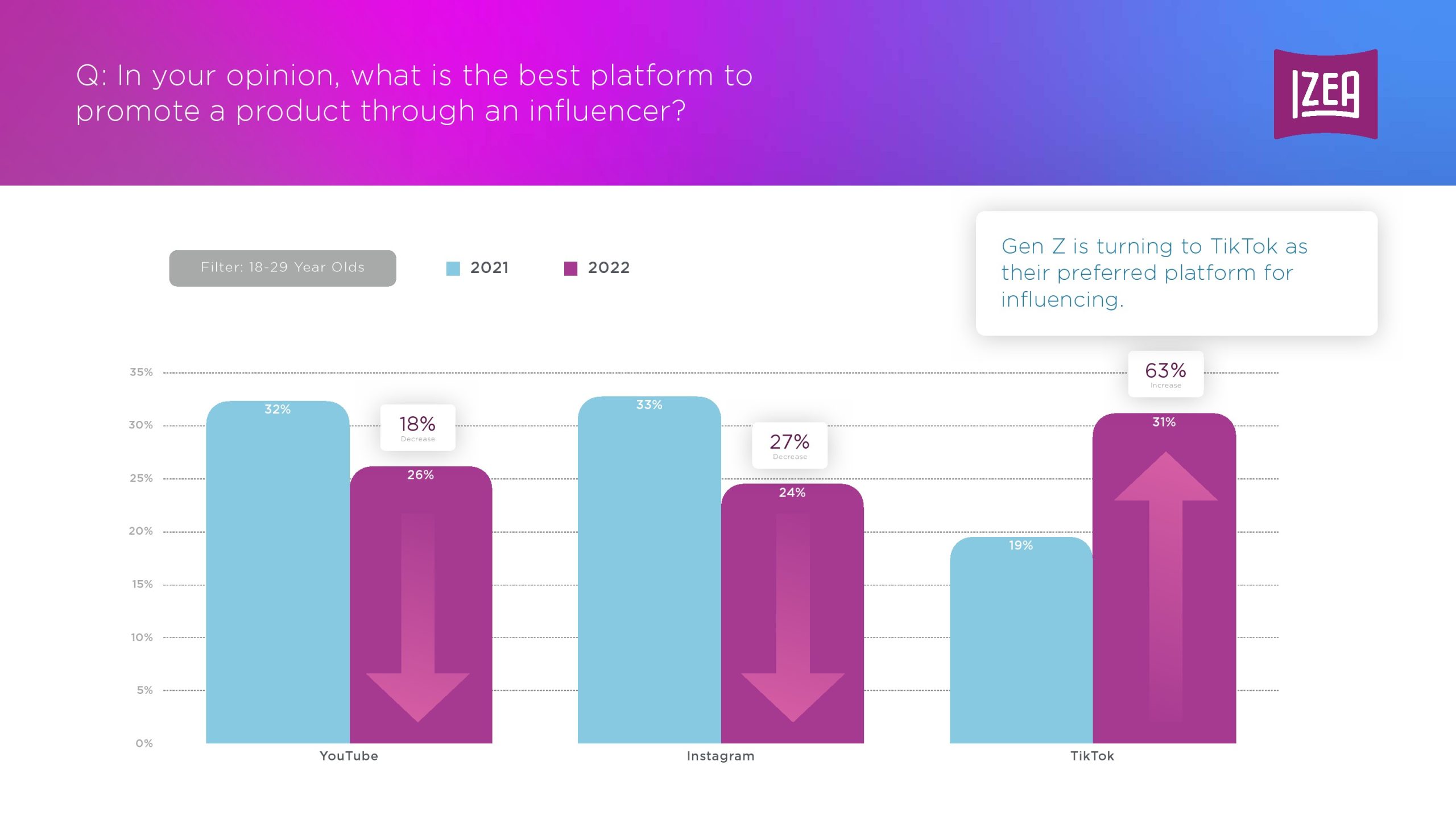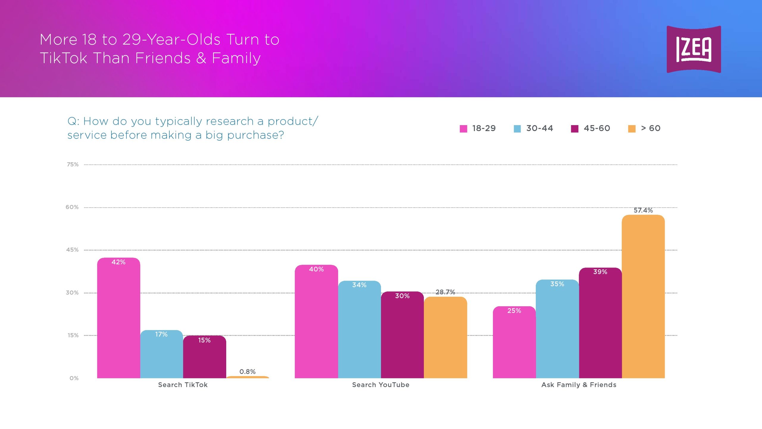根据IZEA的报告,其他年龄段的人在购买大宗商品之前不太可能使用TikTok进行研究。但是,他们确实将YouTube视为研究的目的地。30-44岁的社交媒体用户表示,他们通常会在YouTube上搜索产品或服务(34%),与向家人和朋友咨询(35%)的比例几乎相同;45-60岁的用户比例相差不大,分别为30%和39%。