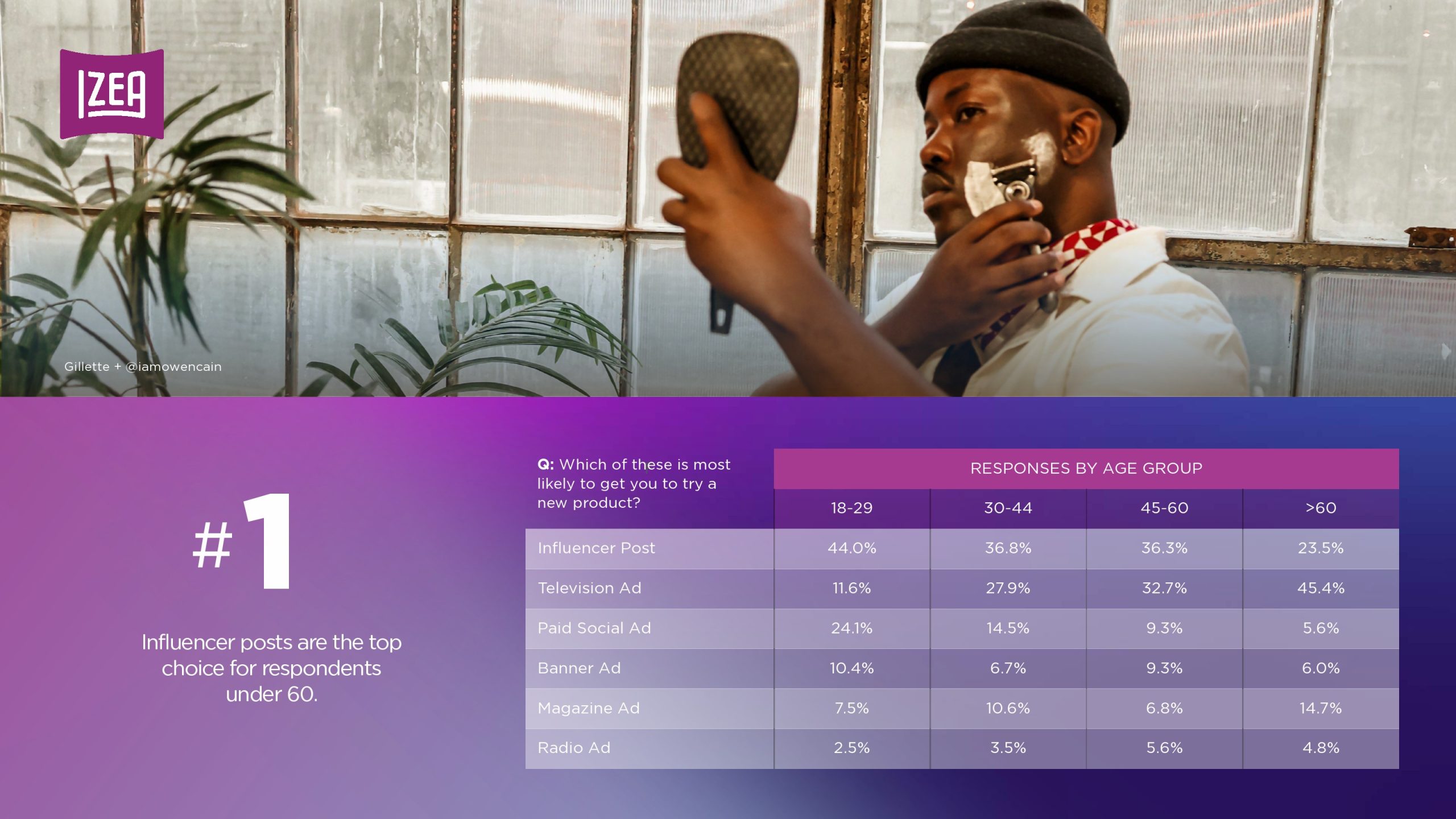 在网红平台方面,更多的18-29岁的消费者认为TikTok是通过网红推广产品的最佳平台,而不是YouTube和Instagram。不出所料,这个年龄段的人认为,与其他广告(包括付费社交广告和电视广告)相比,网红帖子更有可能促使他们尝试新产品。对于年龄最大的人群(60岁以下)来说,电视广告的影响力最大。