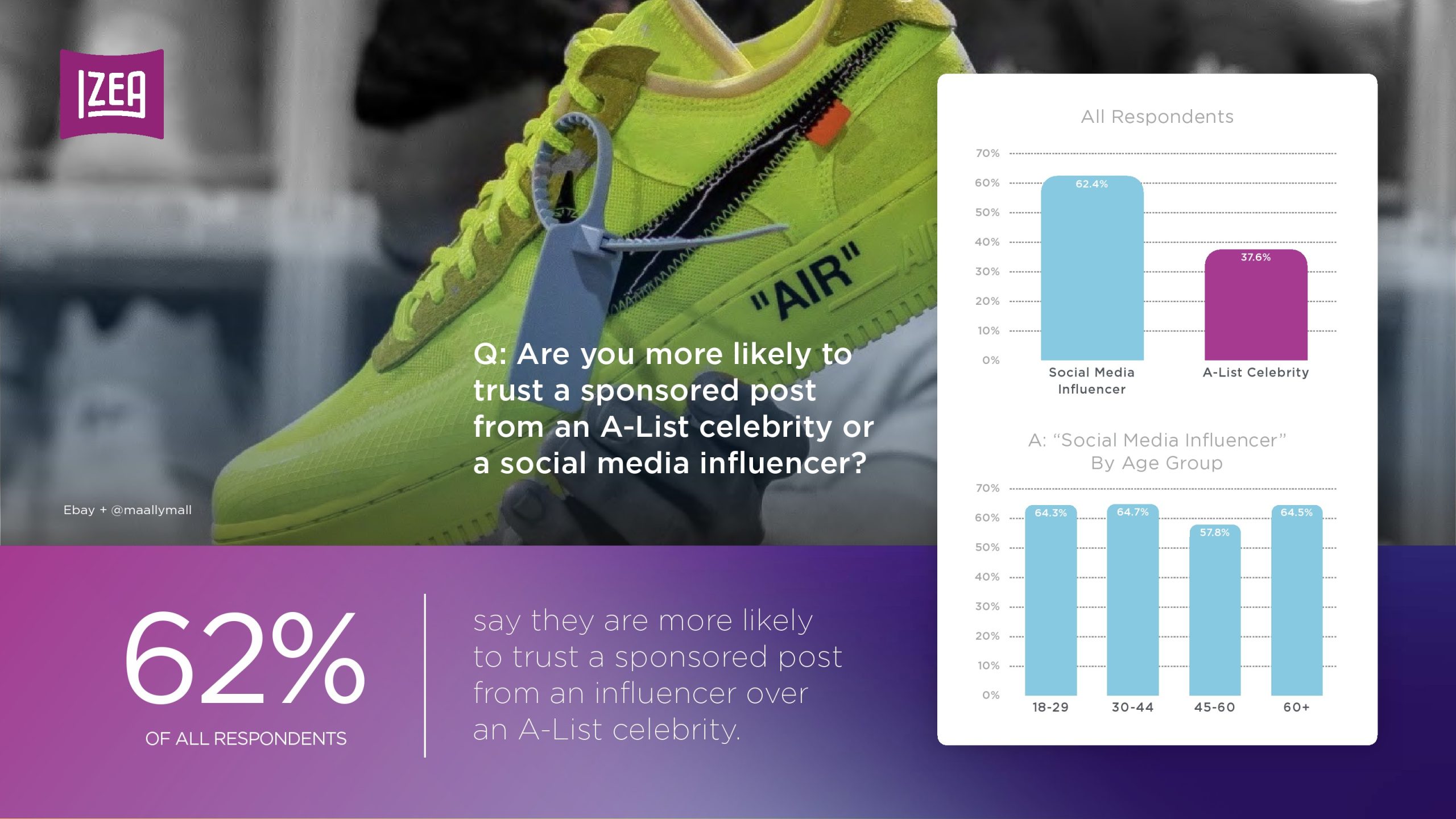 受访者表示,他们更有可能相信社交媒体上意见领袖发布的赞助帖子,而不是一线明星。