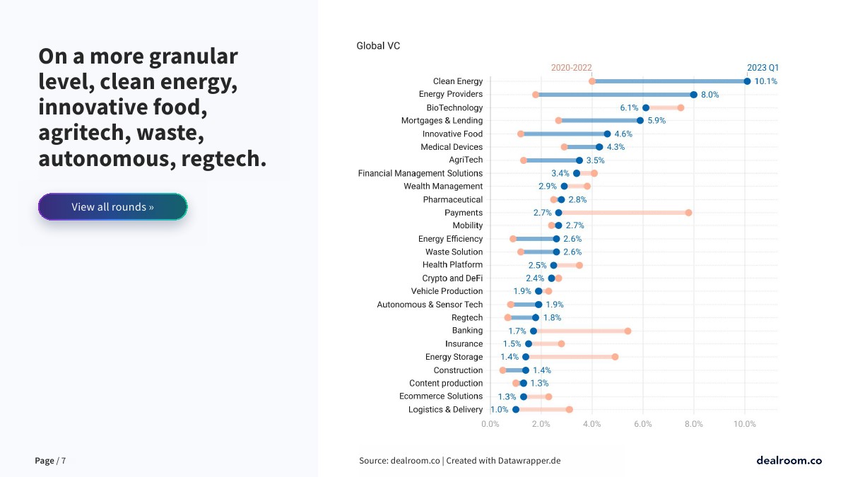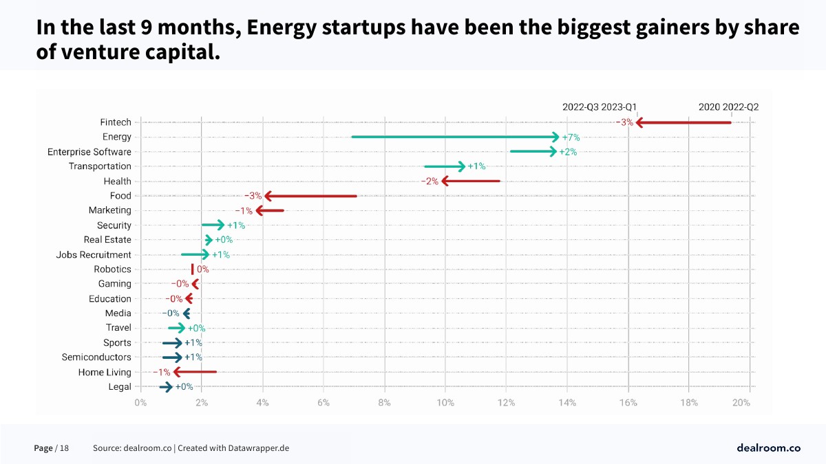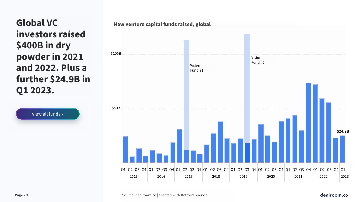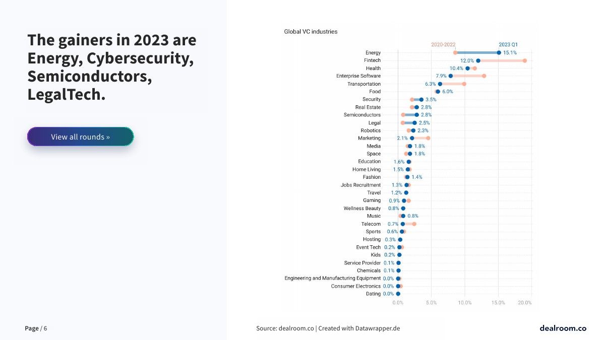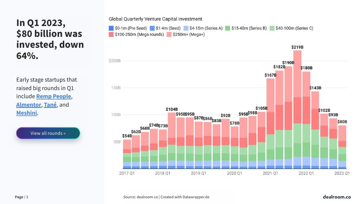 Dealroom发布了“2023年第一季度全球风险投资报告”。2023年第一季度,全球风险投资总额为800亿美元,下降64%。