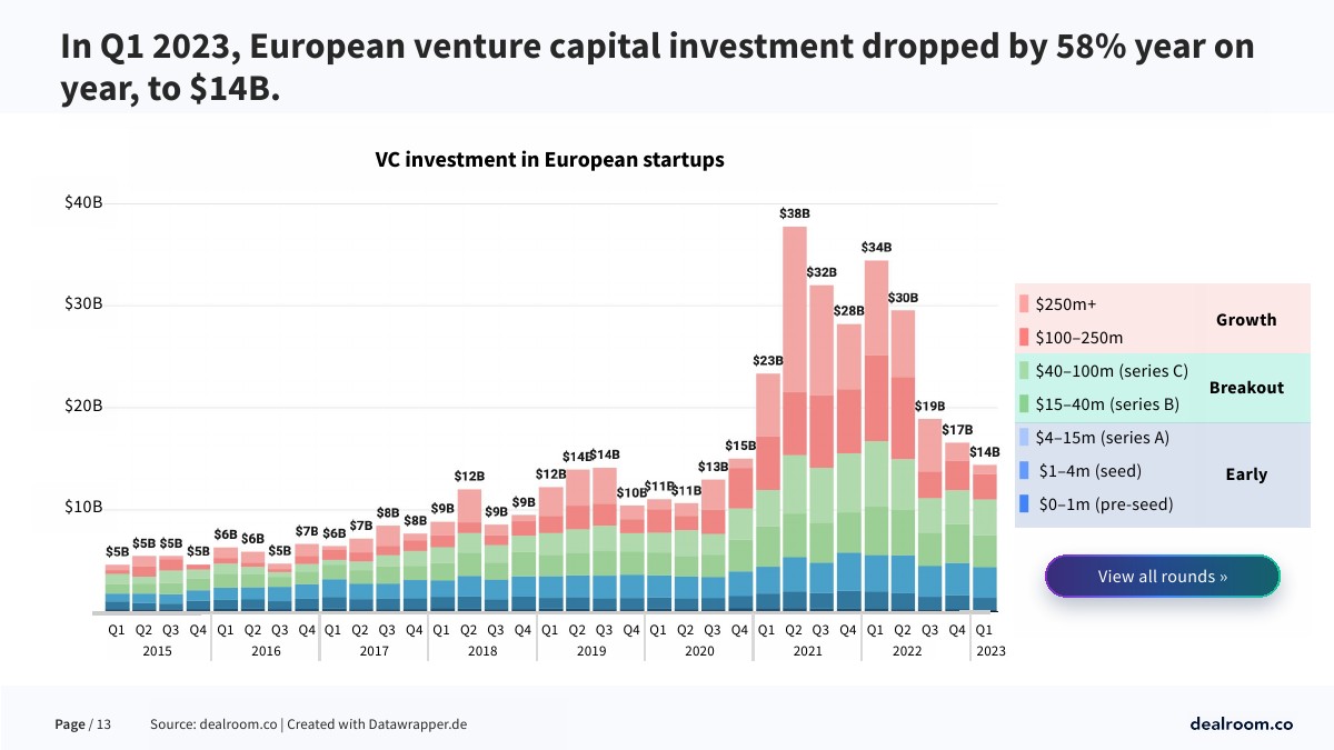 2023年第一季度,欧洲风险投资同比下降58%,降至140亿美元。