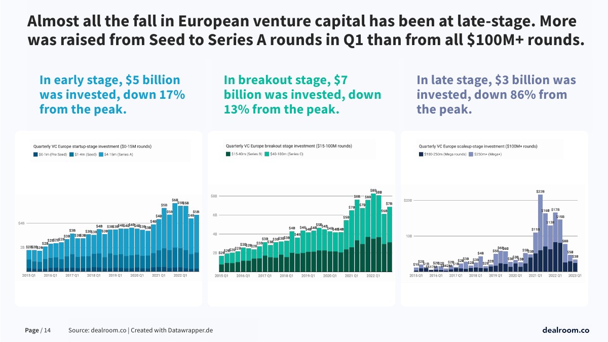 在早期阶段,2023年第一季度的投资额为50亿美元,比峰值下降了30%。