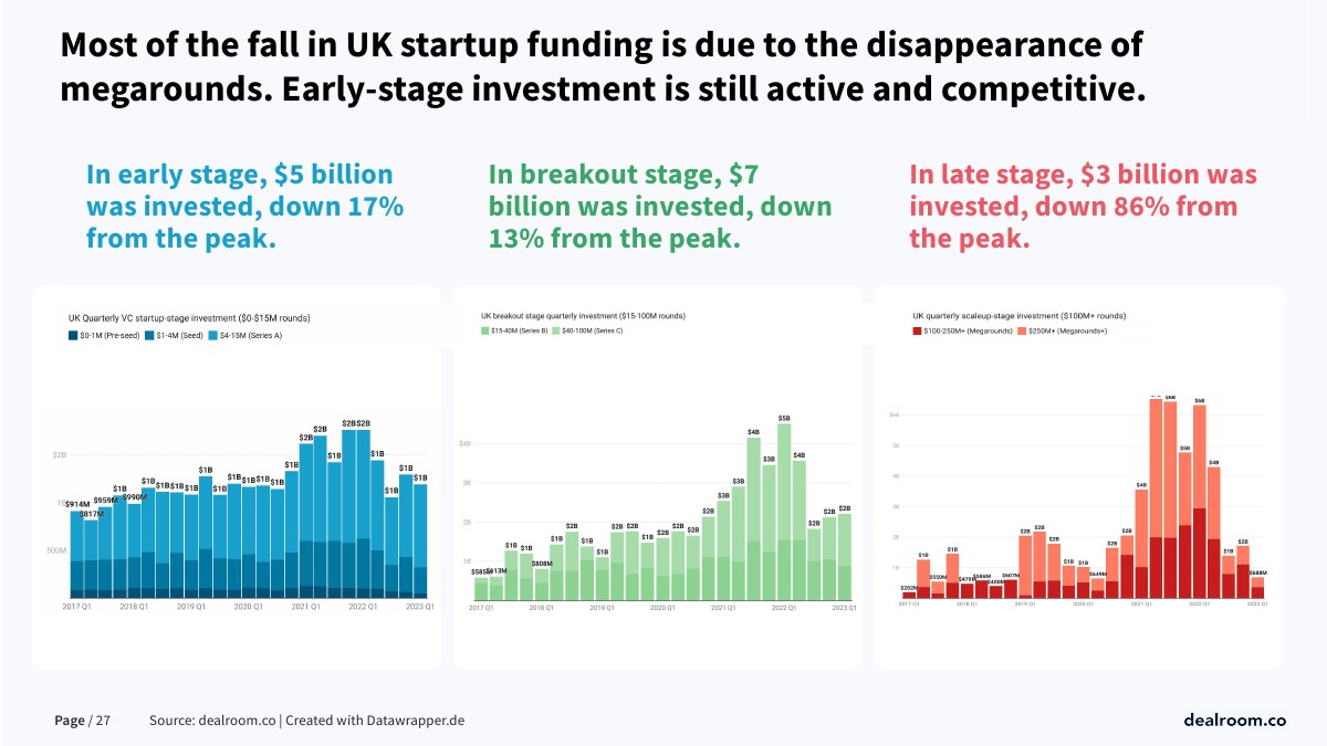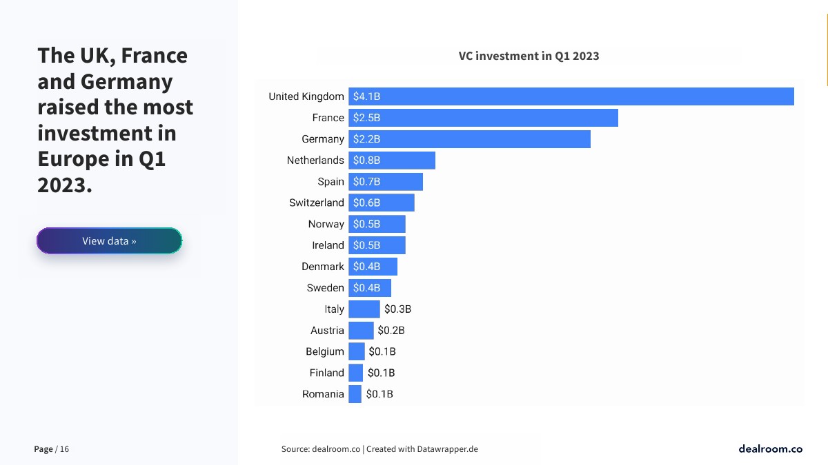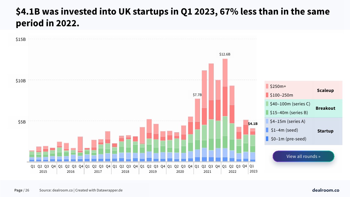 2023年第一季度,英国初创企业获得了41亿美元的投资,比2022年同期减少了67%。
