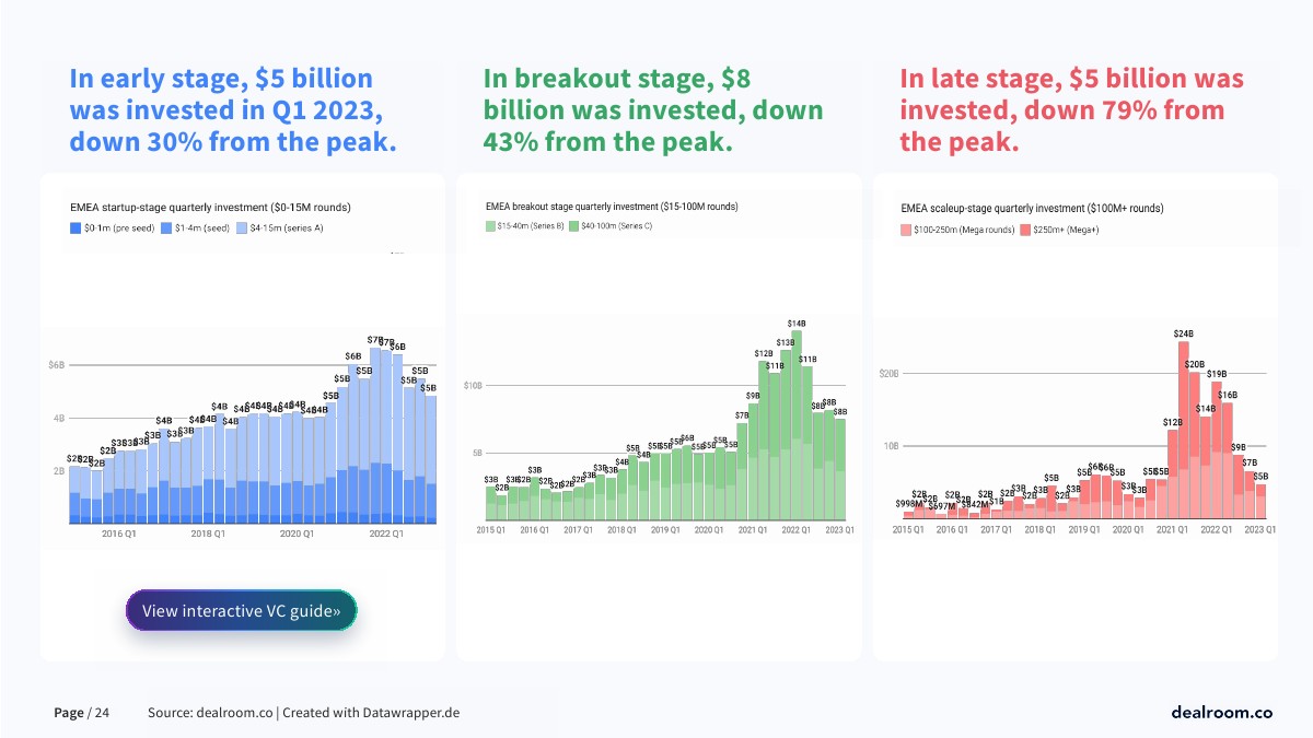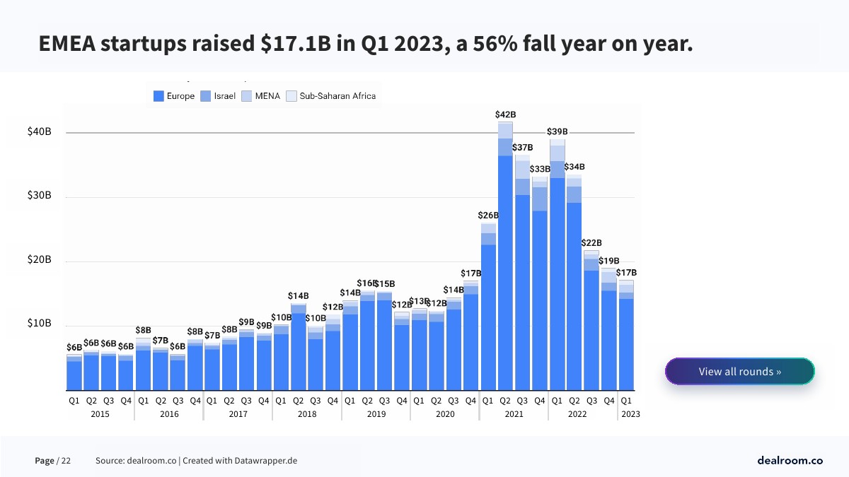 EMEA的初创公司在2023年第一季度获得171亿美元投资,同比下降56%。
