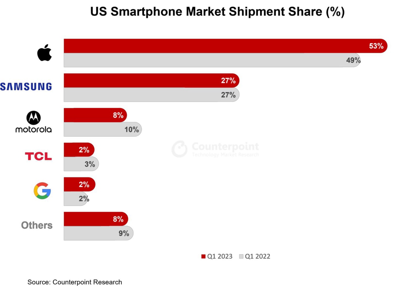 苹果 iPhone 出货量占比从 2022 年第 1 季度的 49%,增加到 53%。