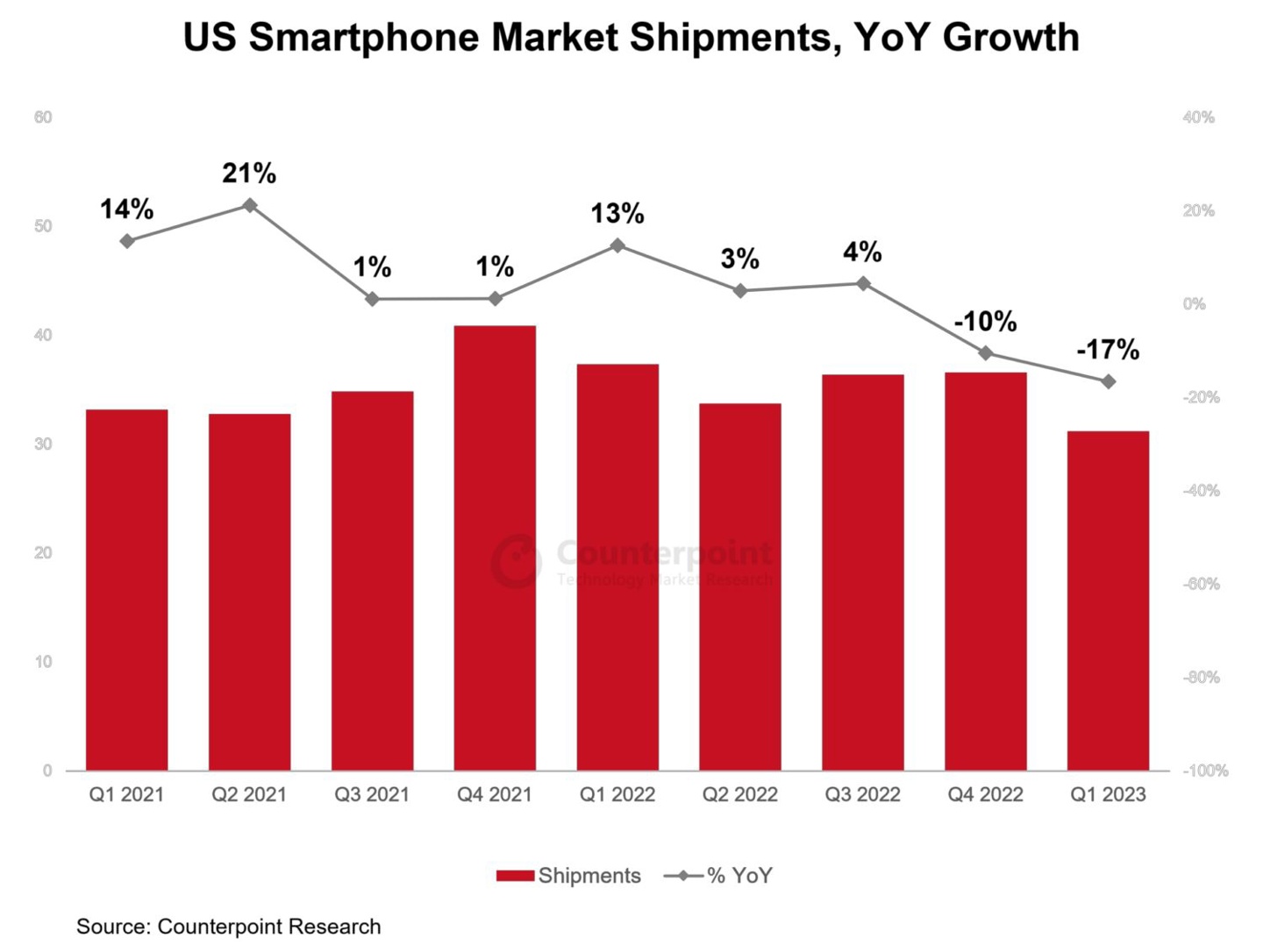 根据市场调查机构 Counterpoint Research 公布的报告,美国 2023 年第 1 季度出货量同比下降 17%,不确定的经济前景迫使消费者推迟购买新设备。