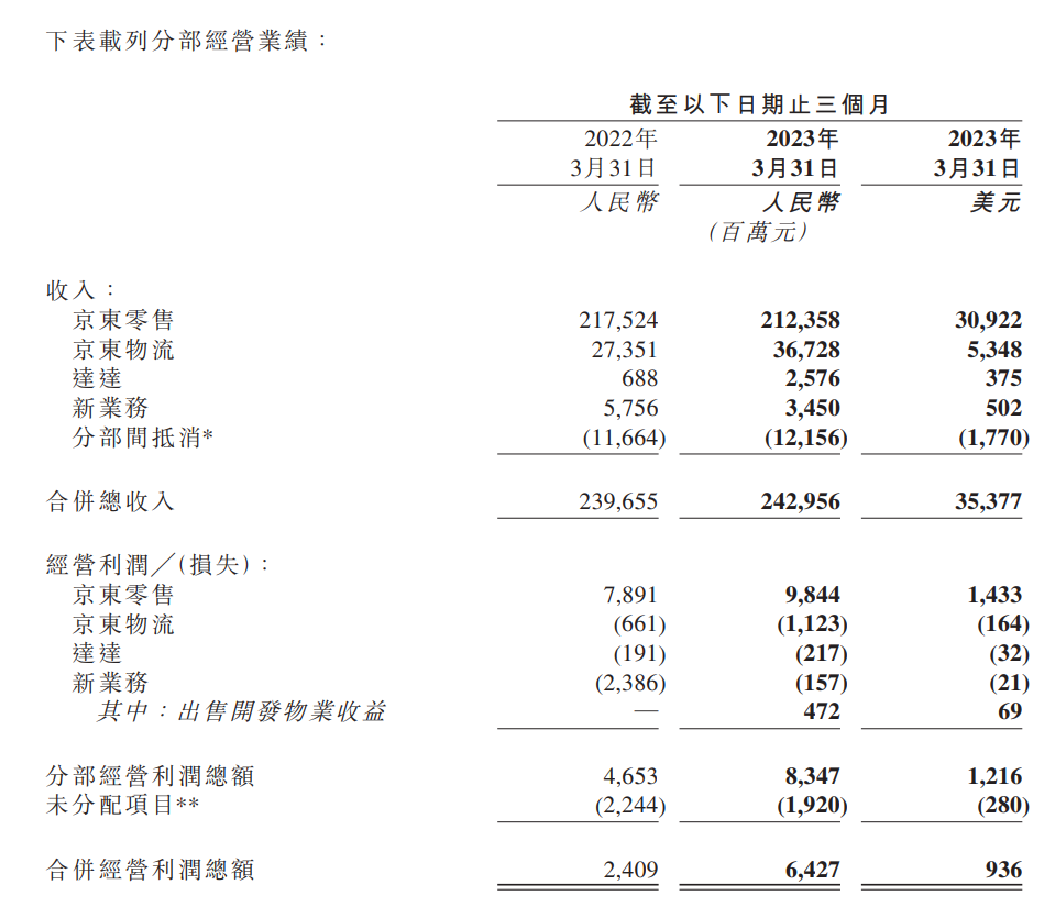 京东集团 2023 年第一季度研发开支同比减少 4.5%,由 2022 年第一季度的人民币 44 亿元减少 4.5% 至 2023 年第一季度的人民币 42 亿元。