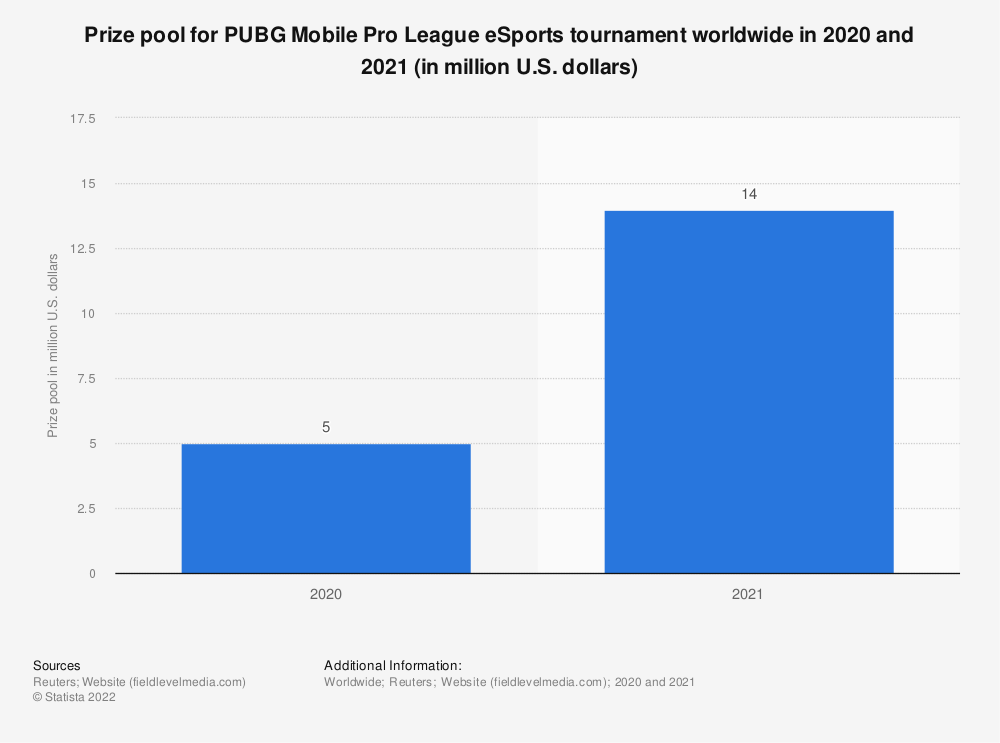 2020年和2021年PUBG Mobile职业联赛全球电子竞技锦标赛奖金池(百万美元)。数据来源:Statista.com