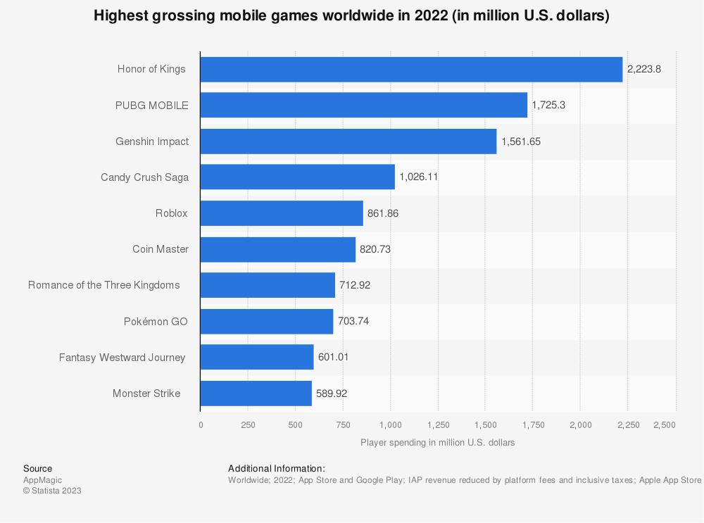 2022年全球收益最高的手机游戏(百万美元)。数据来源:Statista.com