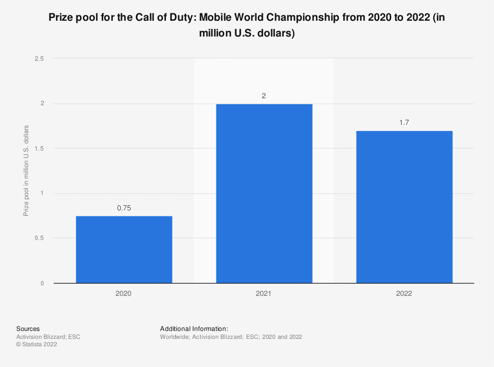 移动电子竞技锦标赛的奖金池可能相当大。《使命召唤:世界锦标赛》的总奖金在2020年还不到100万美元,但到第二年就增长到了200万美元。最近一届《使命召唤:移动世界锦标赛》于2022年12月在北卡罗来纳州罗利举行,总奖金为170万美元。其他移动电子竞技锦标赛的奖金也出现了类似的增长。据报道,PUBG Mobile职业联赛电子竞技锦标赛在2020年的奖金池为500万美元,但到第二年,这一数字几乎增加了两倍。