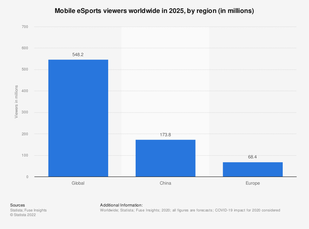近年来,随着移动电子竞技与传统电子竞技一起受到欢迎,移动电子竞技市场蓬勃发展。2019年,全球移动电子竞技观众总数超过4亿,预计这一数字将在未来五年内增长。在整体观众人数的增长中,全球移动电子竞技观众的很大一部分增长预计来自中国和欧洲。