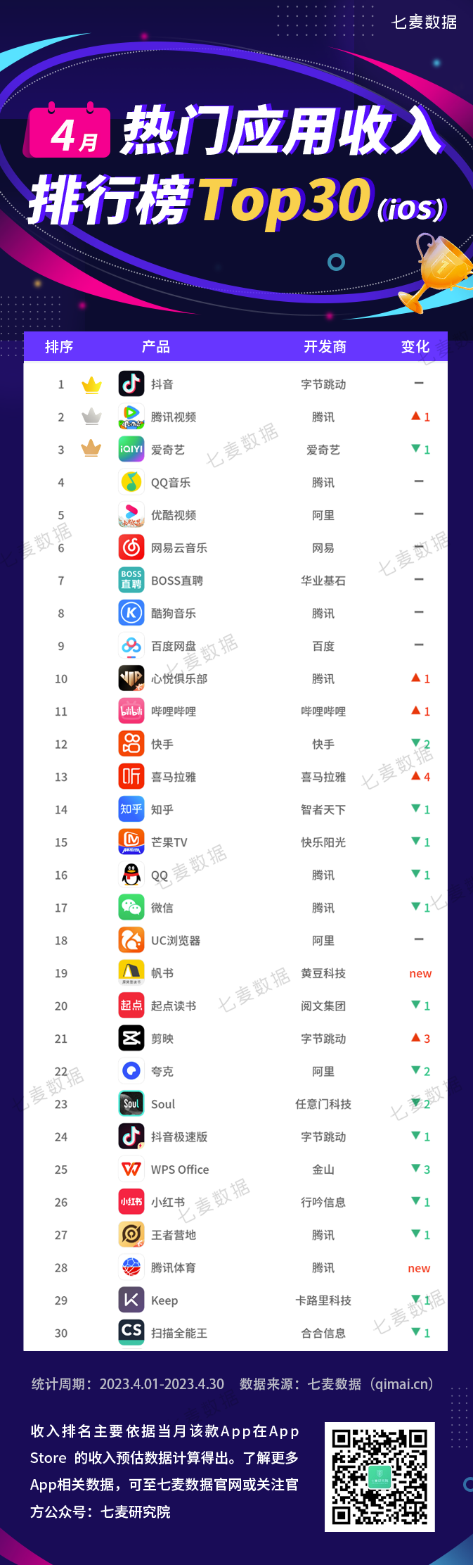 近日,七麦数据发布 2023 年 4 月热门应用排行榜,包含应用下载榜和收入榜。
