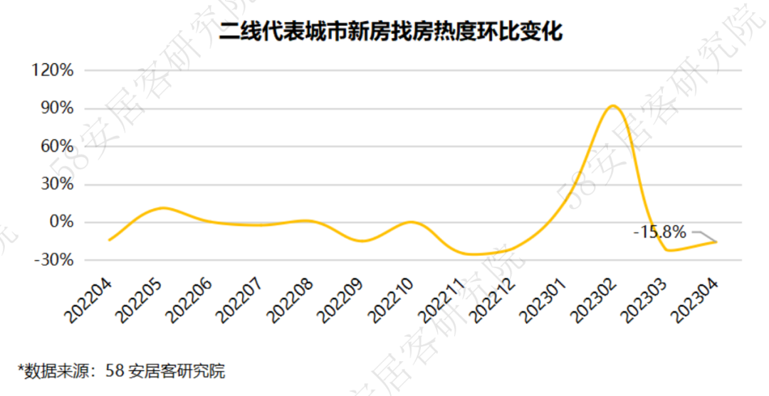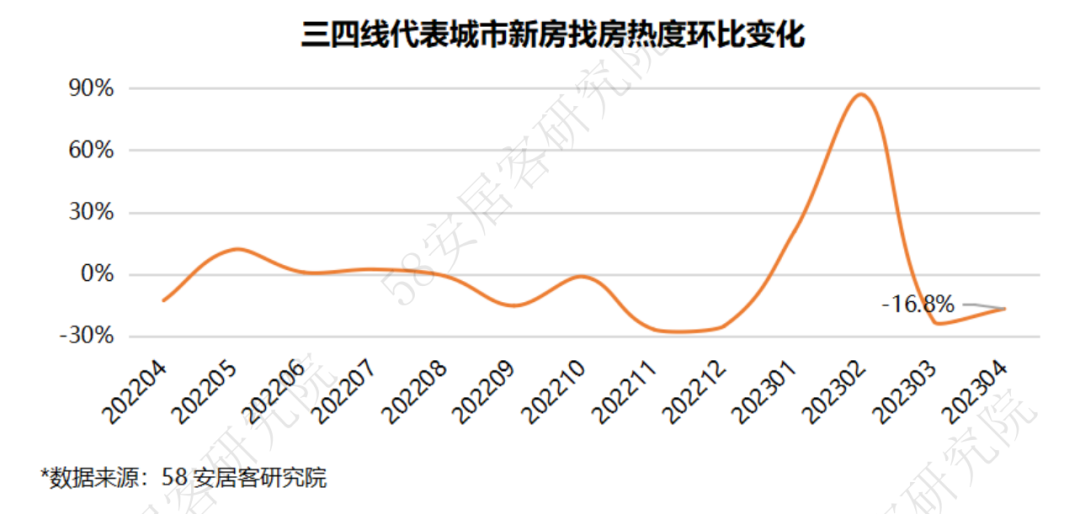 4月,新房找房热度继续降低,环比和同比跌幅均超过15%。随着积压需求在一季度的集中释放,存量购房需求逐步减少,新增需求尚未大量产生,对市场的支撑不足,行业或将会回到继续筑底阶段。