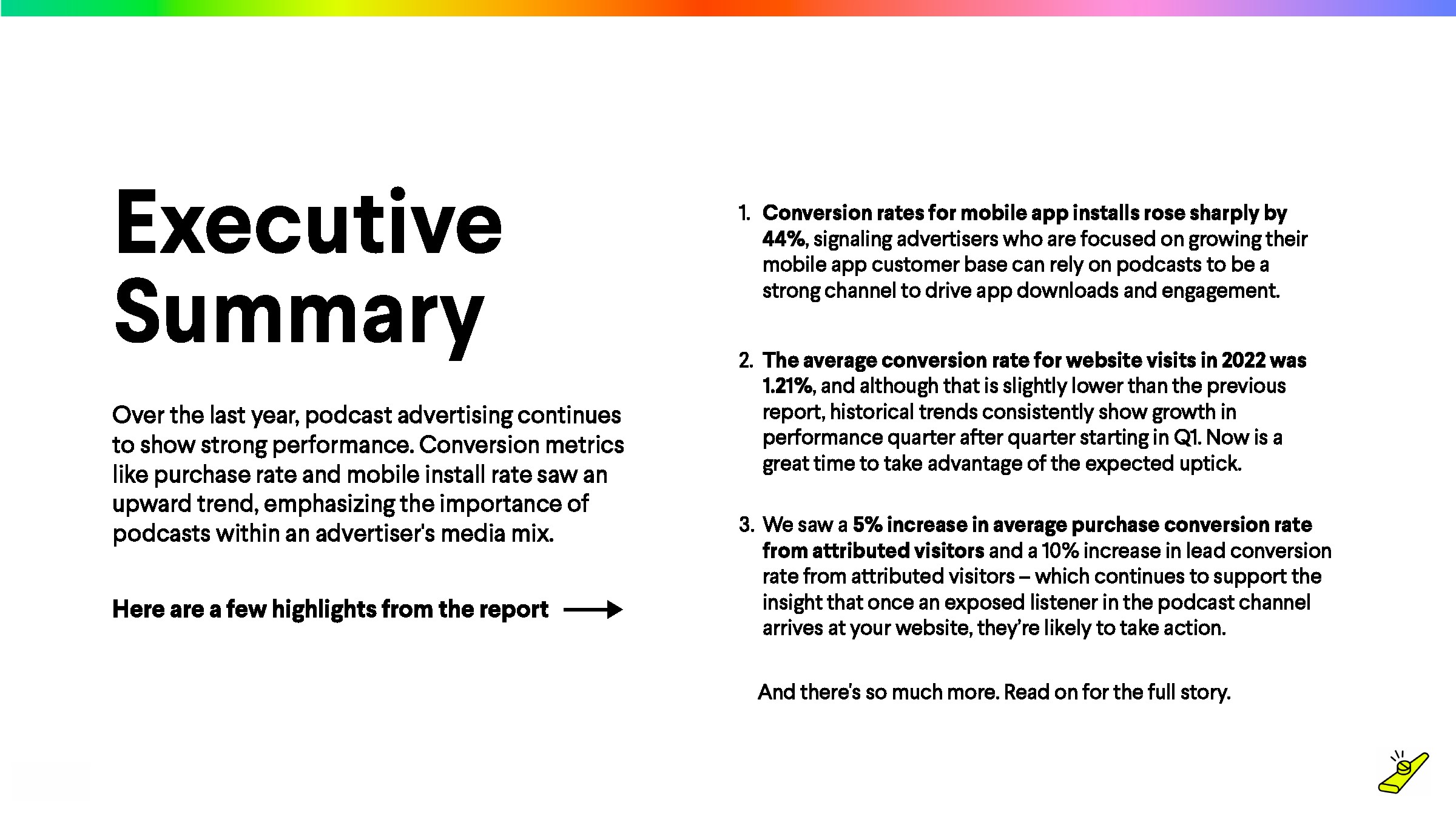 在过去的一年里,播客广告继续表现强劲。转化率和手机安装率等转化指标呈现上升趋势,这凸显了播客在广告主媒体组合中的重要性。