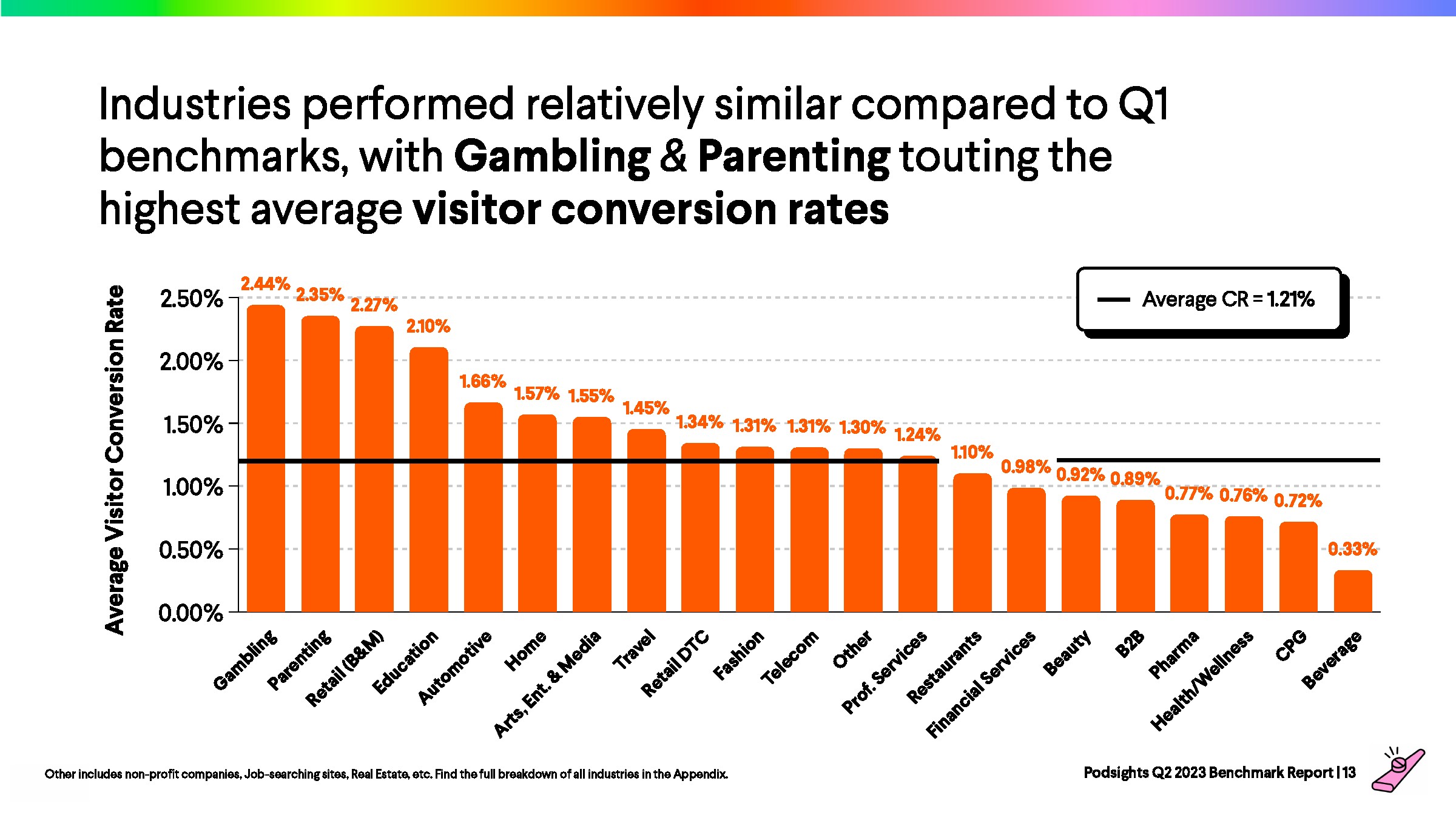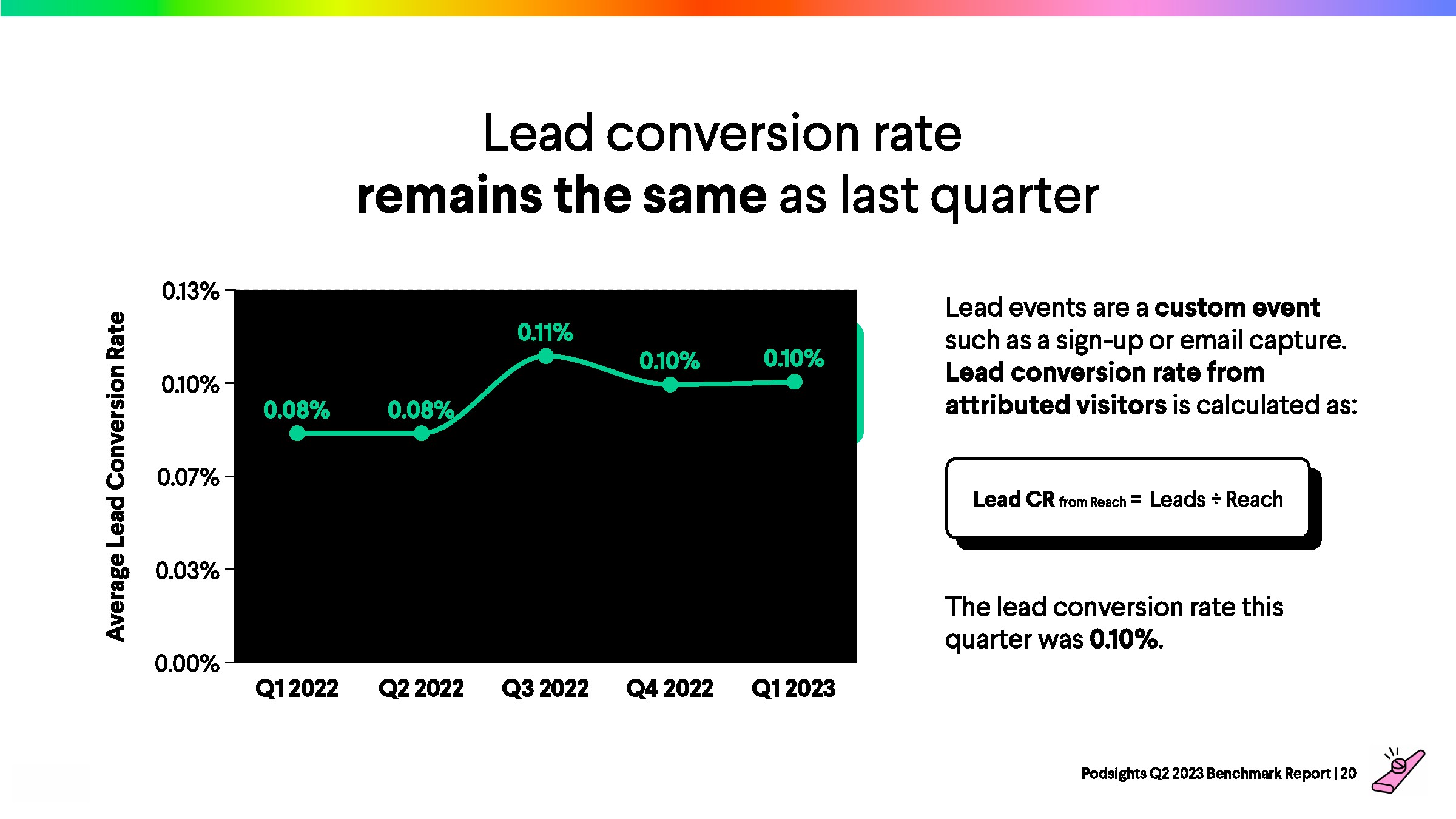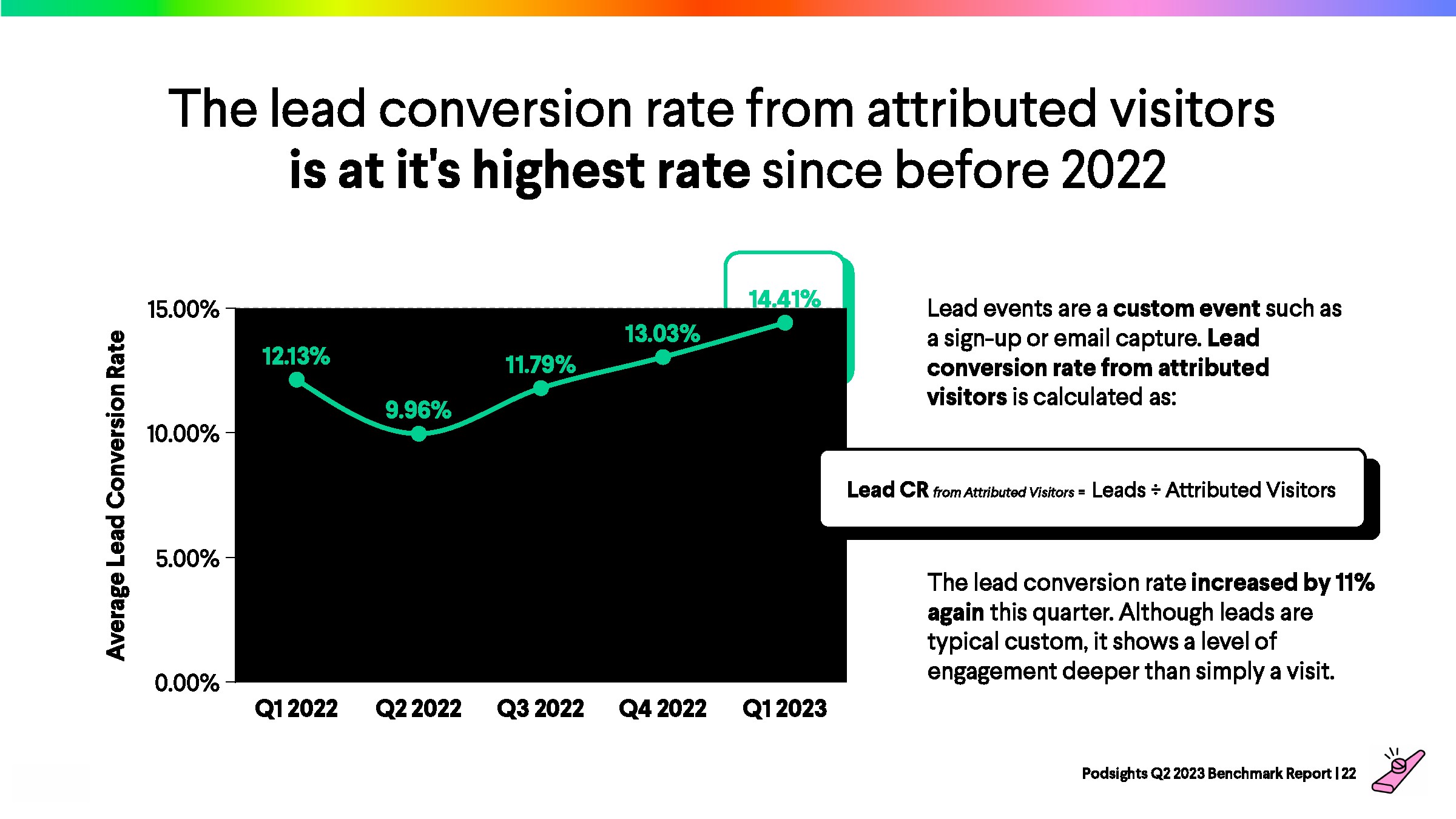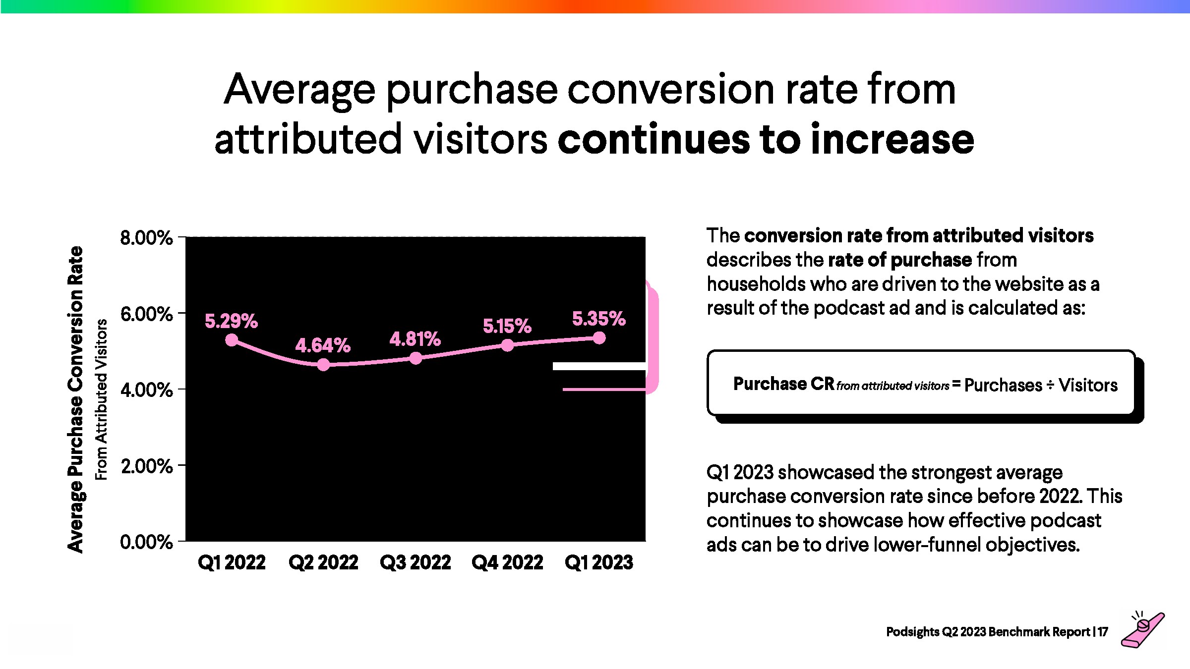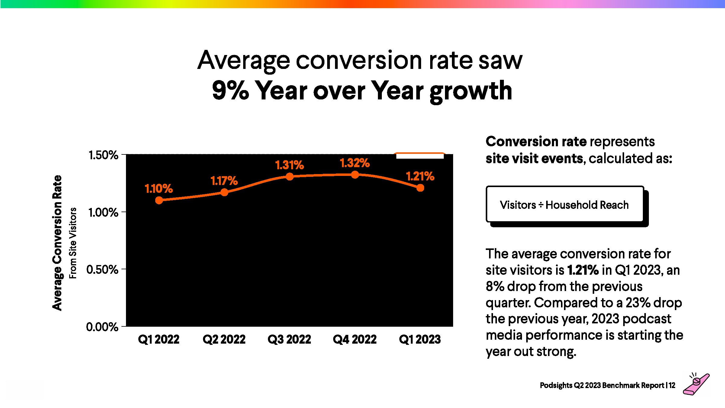 2023年第一季度,网站访问者的平均转化率为1.21%,比上一季度下降了8%。与前一年的下降率(-23%)相比,2023年播客媒体在年初表现强劲。