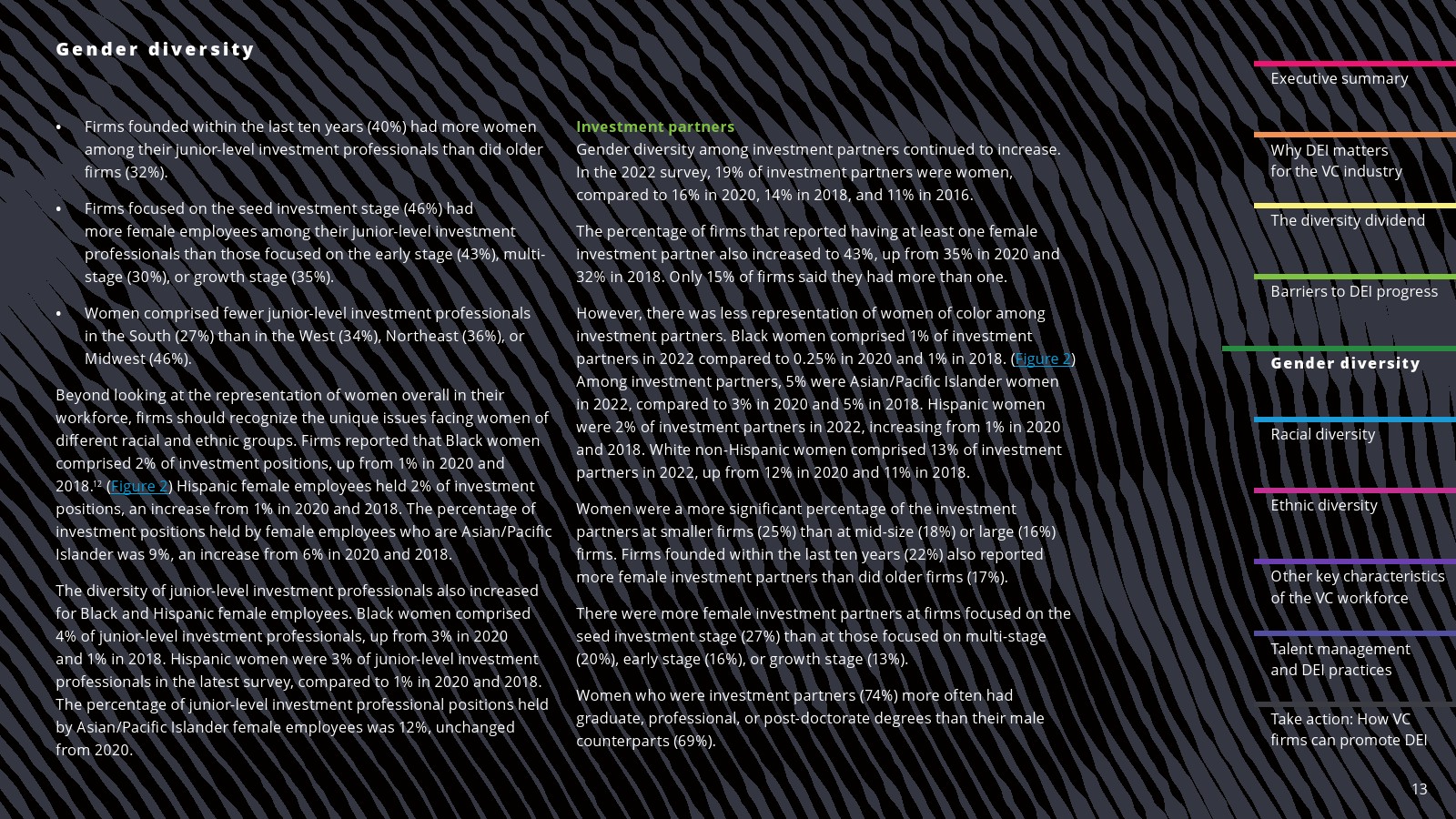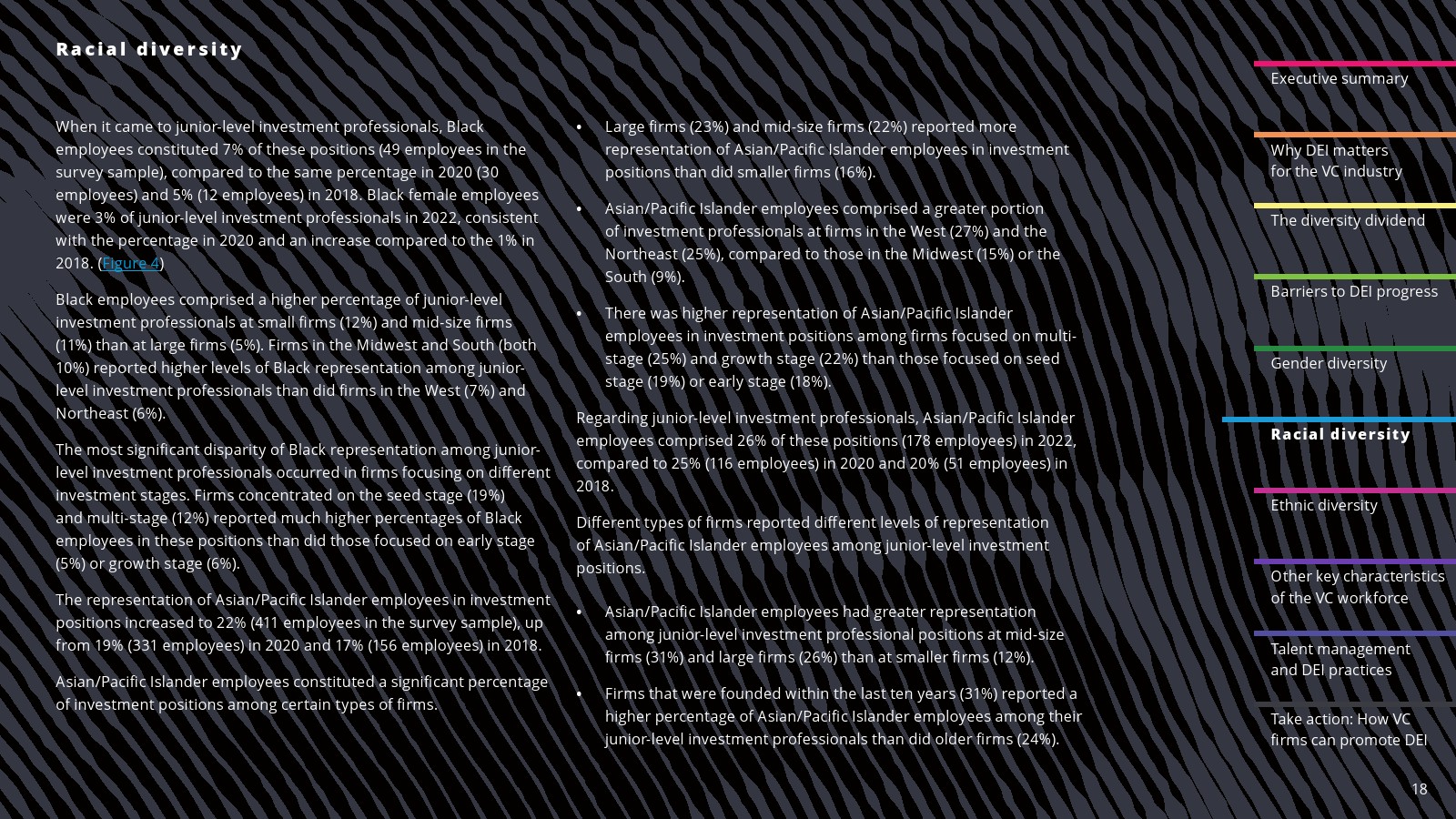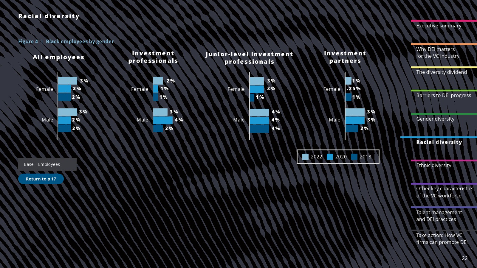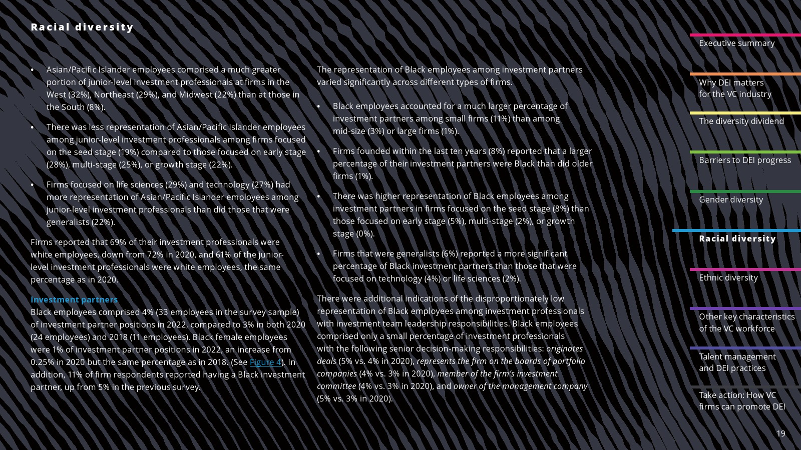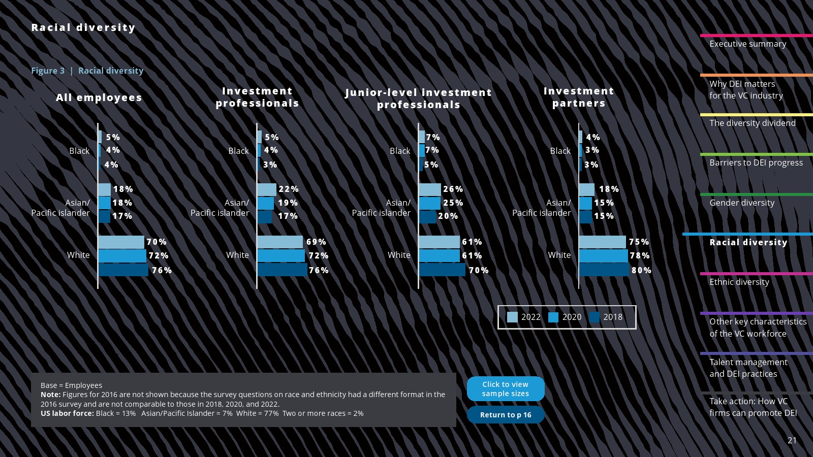 在一些领域,白人员工的比例有所下降。2022年,白人员工占投资职位的69%,占投资合伙人的75%。白人员工在初级投资专业人士中的比例(61%)与2020年持平,但低于2018年(78%)。