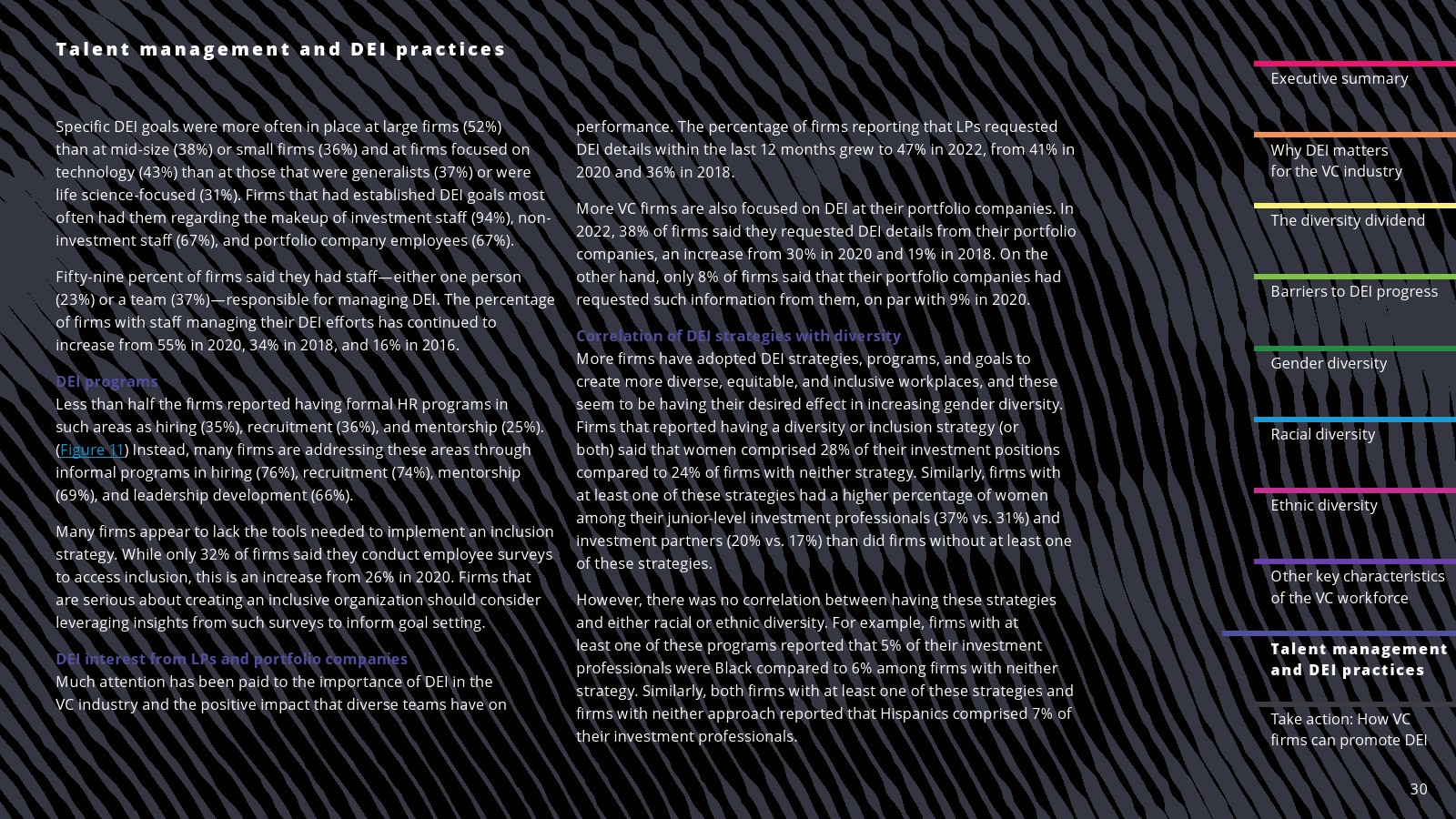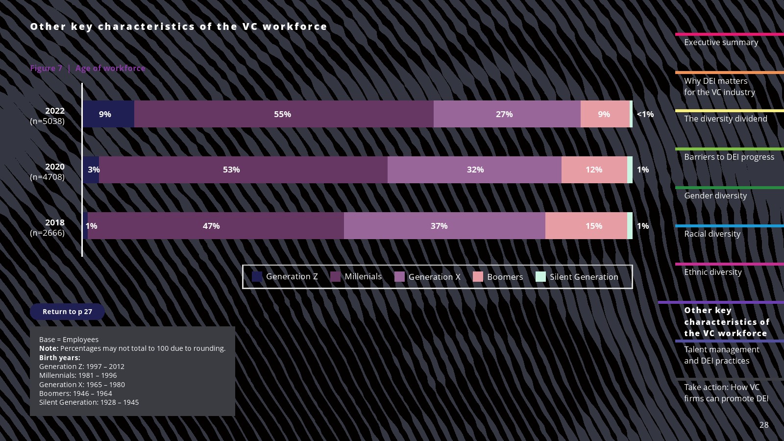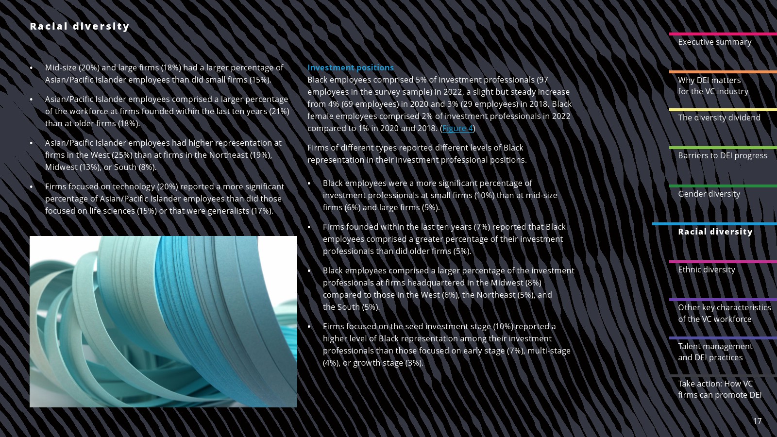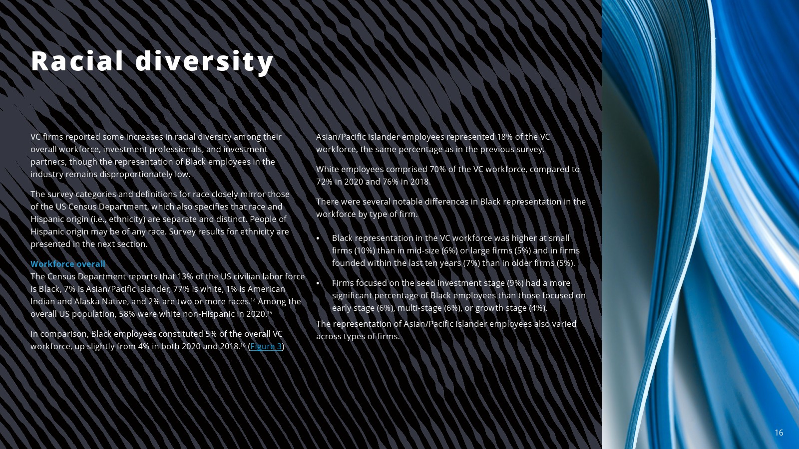 在一些领域,白人员工的比例有所下降。2022年,白人员工占投资职位的69%,占投资合伙人的75%。白人员工在初级投资专业人士中的比例(61%)与2020年持平,但低于2018年(78%)。