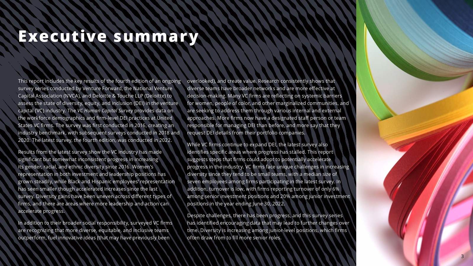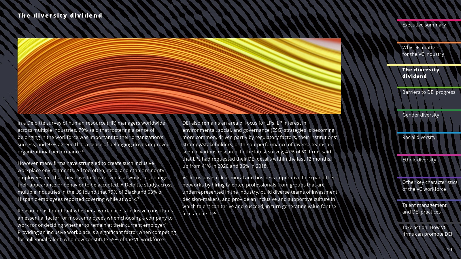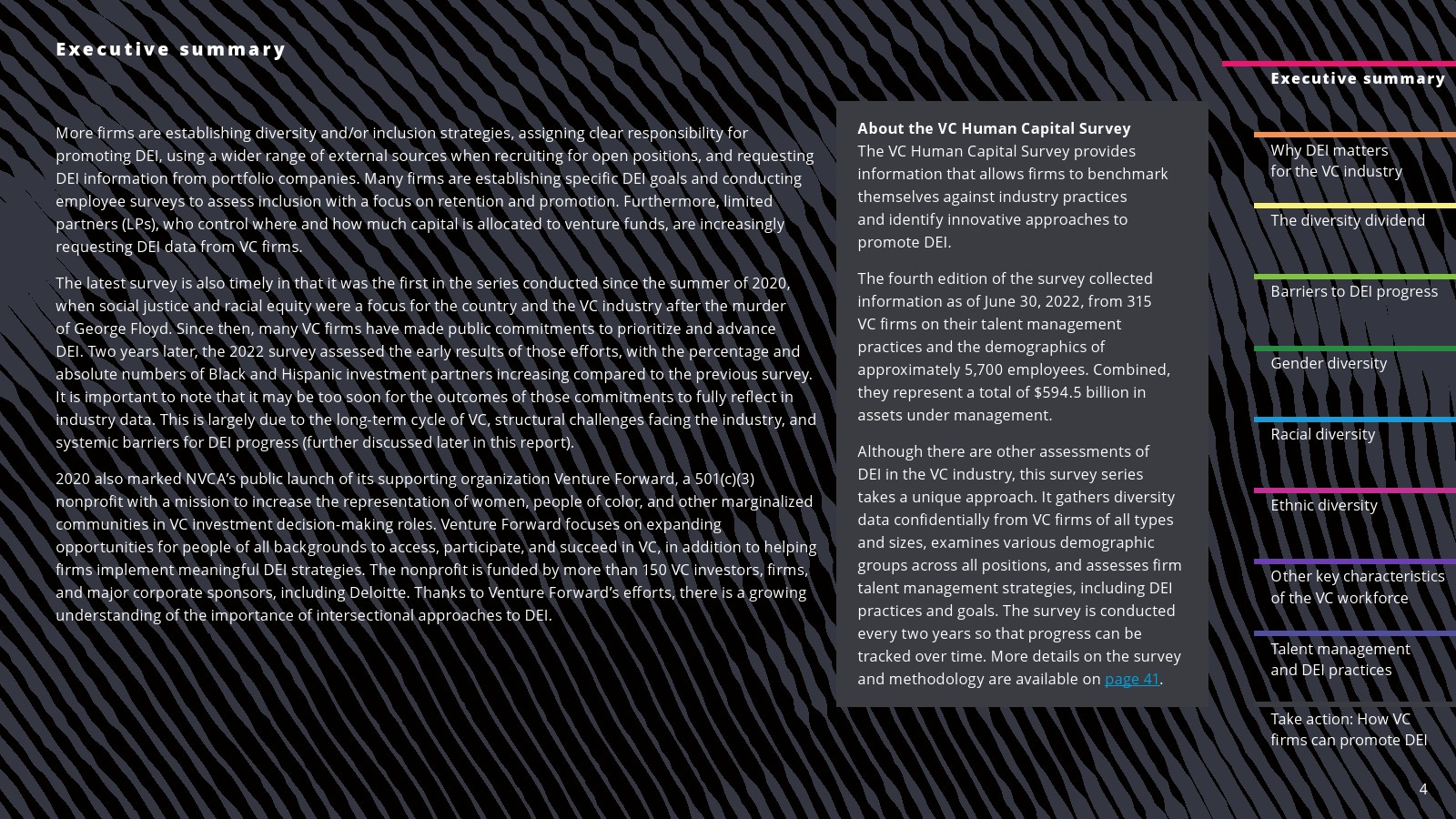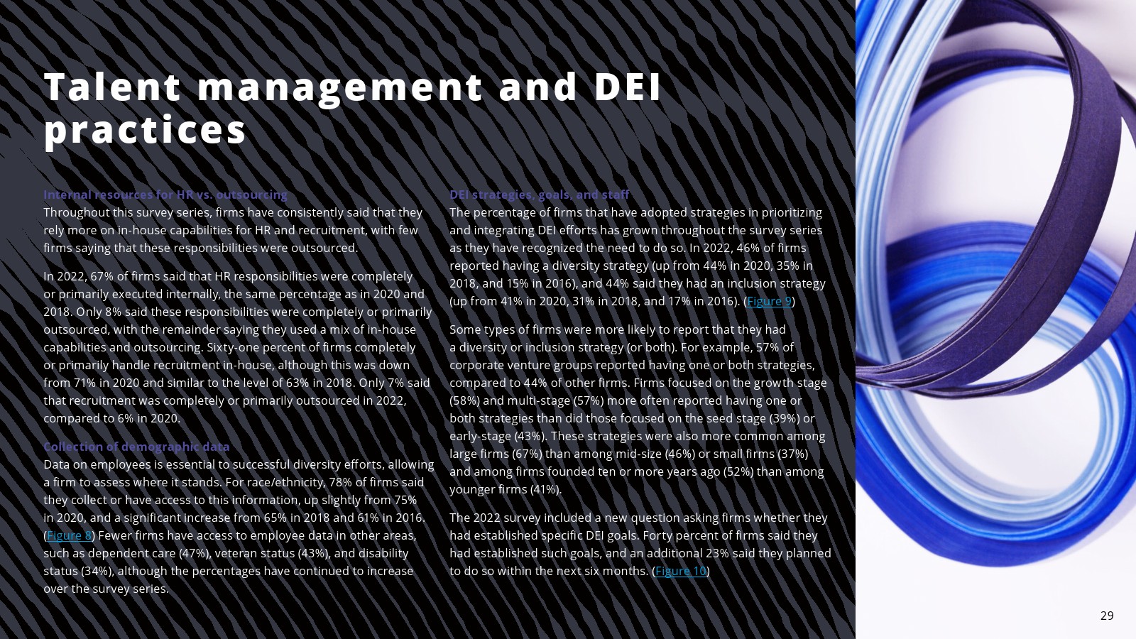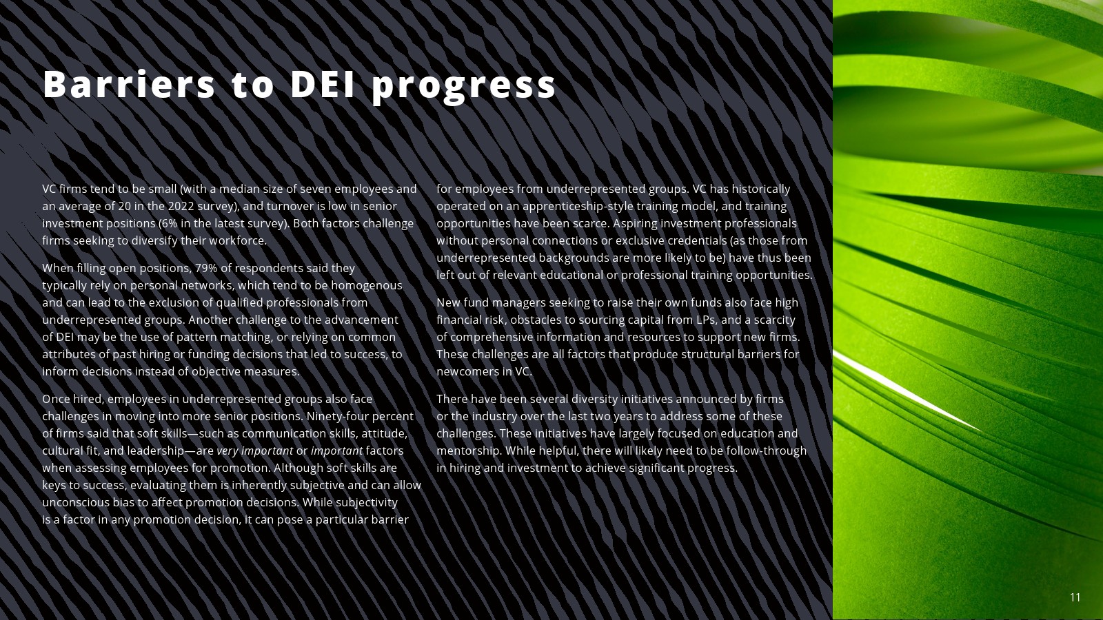 在一些领域,白人员工的比例有所下降。2022年,白人员工占投资职位的69%,占投资合伙人的75%。白人员工在初级投资专业人士中的比例(61%)与2020年持平,但低于2018年(78%)。