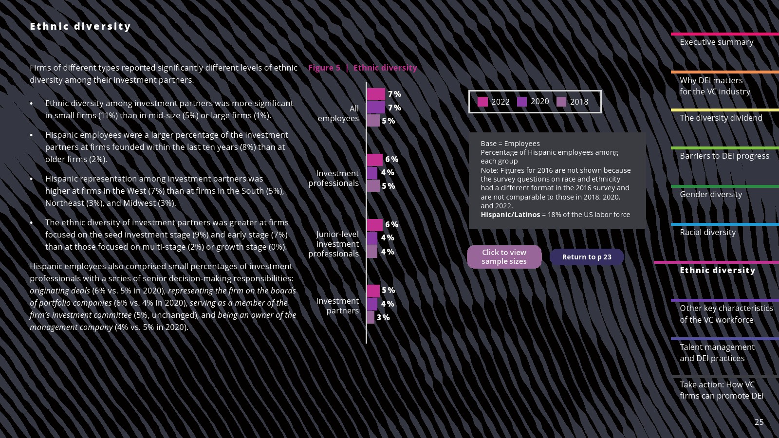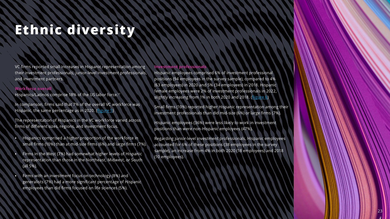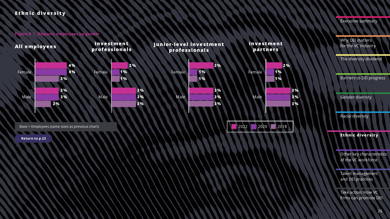 西班牙裔代表有所改善。2022年,西班牙裔员工占投资职位的6%,占投资合伙人职位的5%。西班牙裔在初级投资专业人士中的比例也从2020年和2018年的4%上升到2022年的5%。