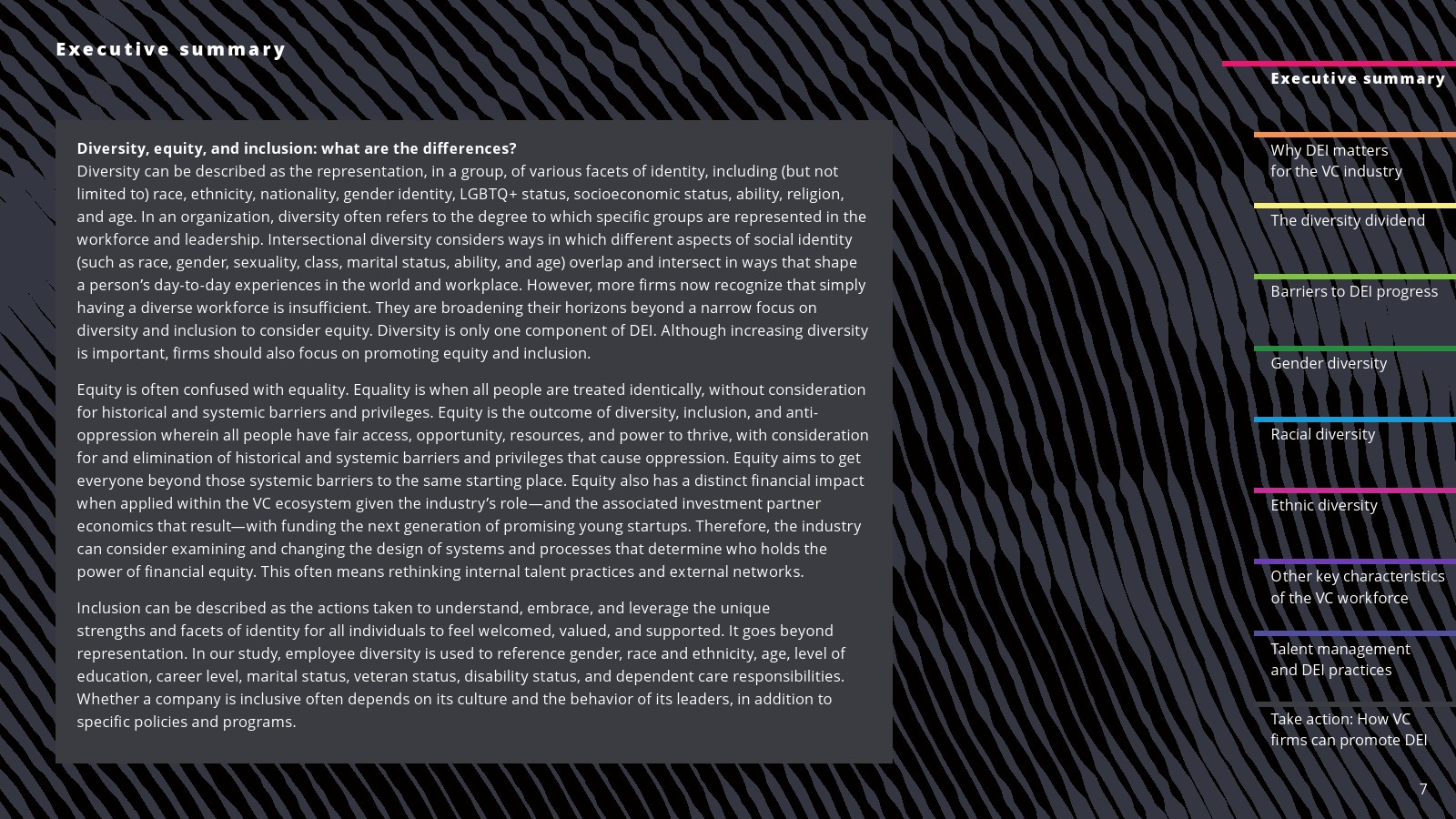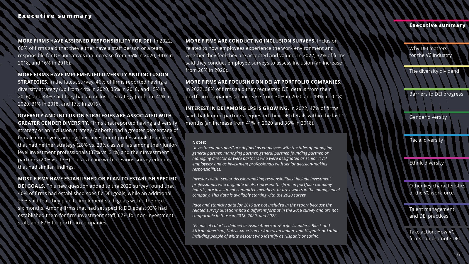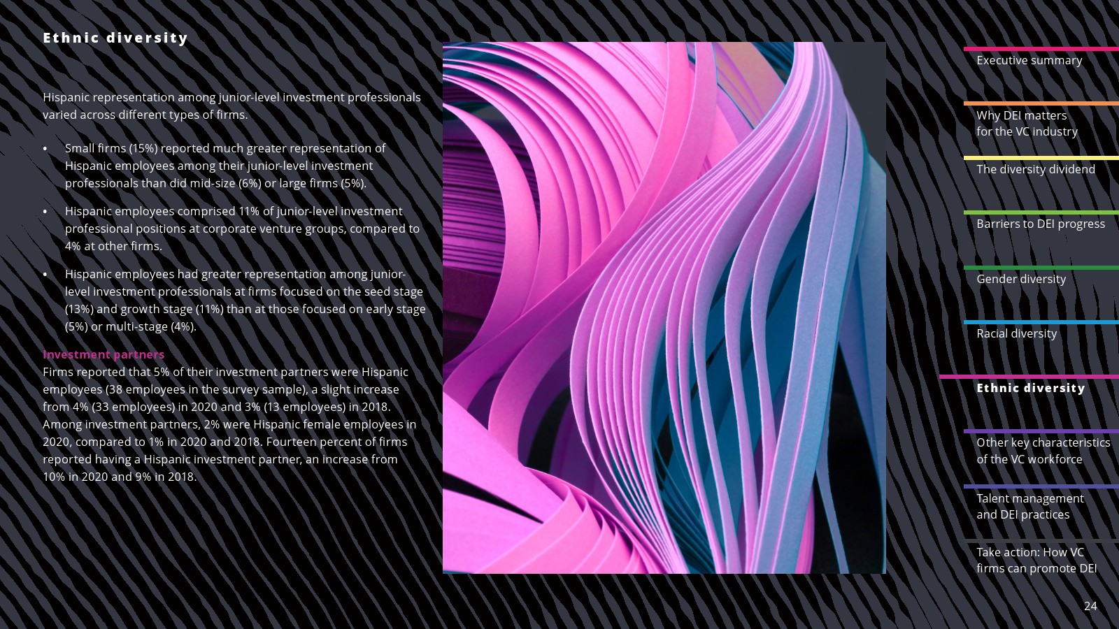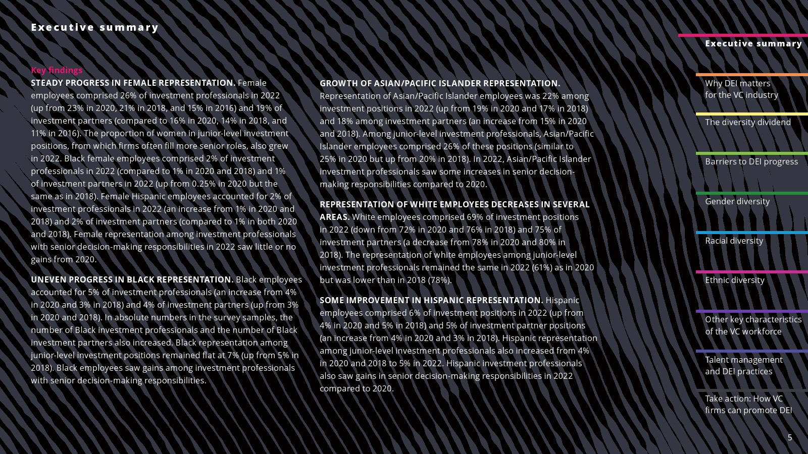 西班牙裔代表有所改善。2022年,西班牙裔员工占投资职位的6%,占投资合伙人职位的5%。西班牙裔在初级投资专业人士中的比例也从2020年和2018年的4%上升到2022年的5%。