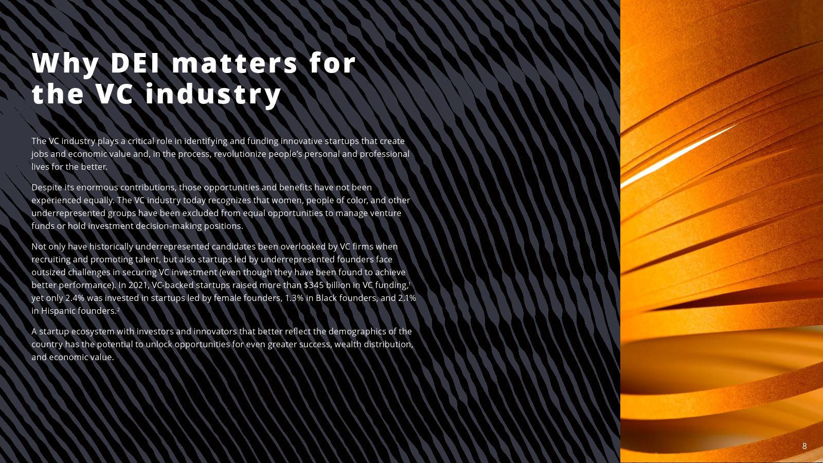 2022年,非洲裔女性员工占投资专业人士的2%,占投资合伙人的1%。西班牙裔女性员工占投资专业人士的2%,占投资合伙人的2%。与2020年相比,2022年担任高级决策职责的投资专业人士中的女性比例几乎没有增加。