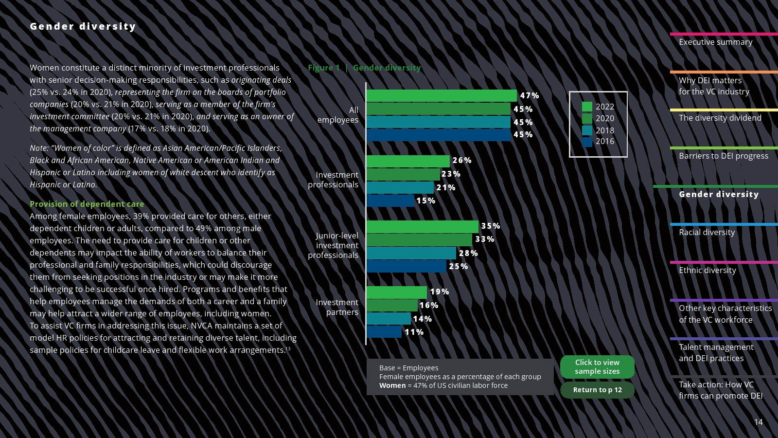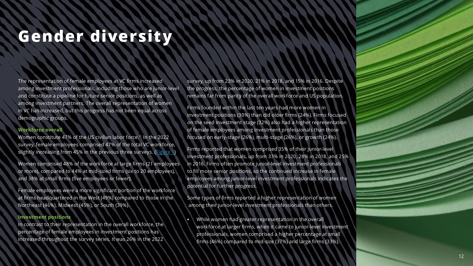 女性代表比例稳步提高。2022年,女性员工占投资专业人士的26%,占投资合伙人的19%。2022年,担任初级投资职位的女性比例也有所增长。