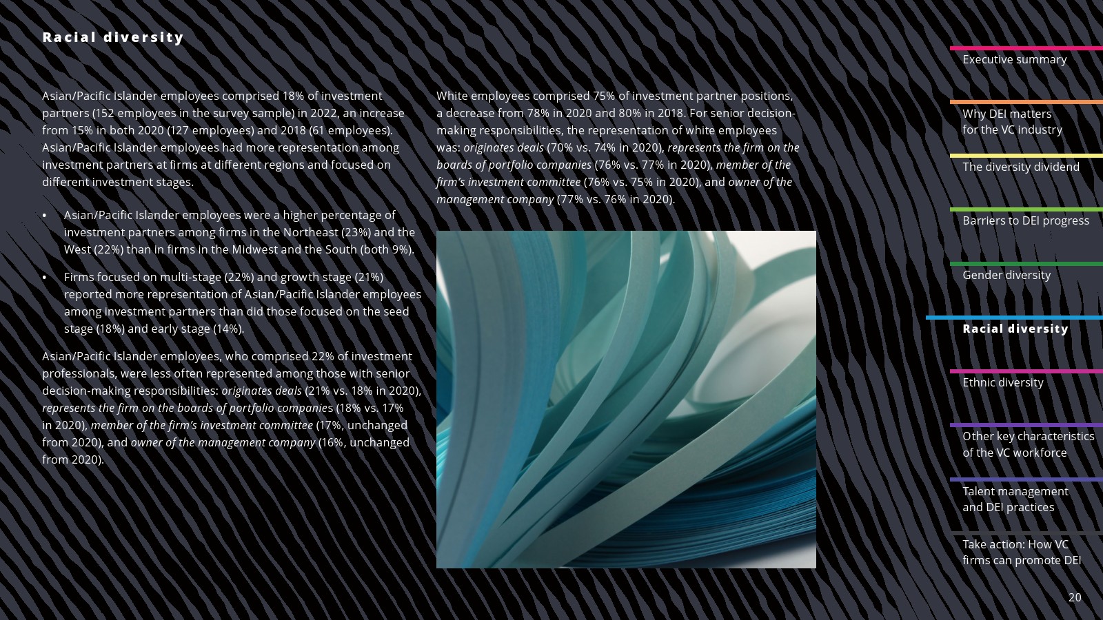 亚洲/太平洋岛民代表增长。2022年,亚太岛民员工在投资职位中的比例为22%,在投资合伙人中的比例为18%。在初级投资专业人士中,亚太岛民员工占26%。与2020年相比,亚太岛民投资专业人士在2022年的高级决策者中所占比例有所增加。